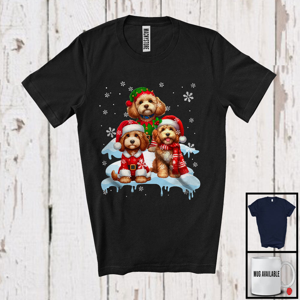 Three Santa Elf Cockapoos On Snow; Adorable Christmas Snowing Dog; Family X-mas Group T-Shirt