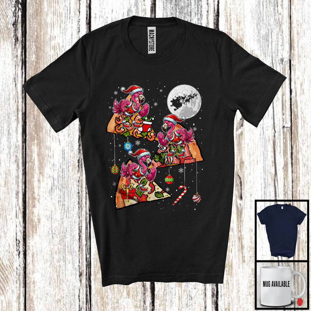 Three Santa Flamingo Riding Pizza; Humorous Christmas Pizza Food Galaxy; Family Group T-Shirt