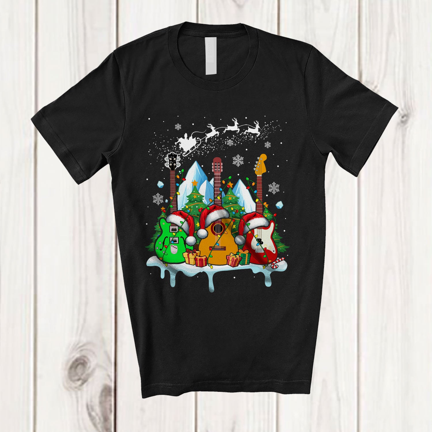 Three Santa Guitars; Amusing Christmas Lights Guitar Player; Guitarist Family Group T-Shirt. This cotton t-shirt is a durable staple product with a classic fit. One of the most popular items, it has a relaxed style made for everyday and casual wear.
