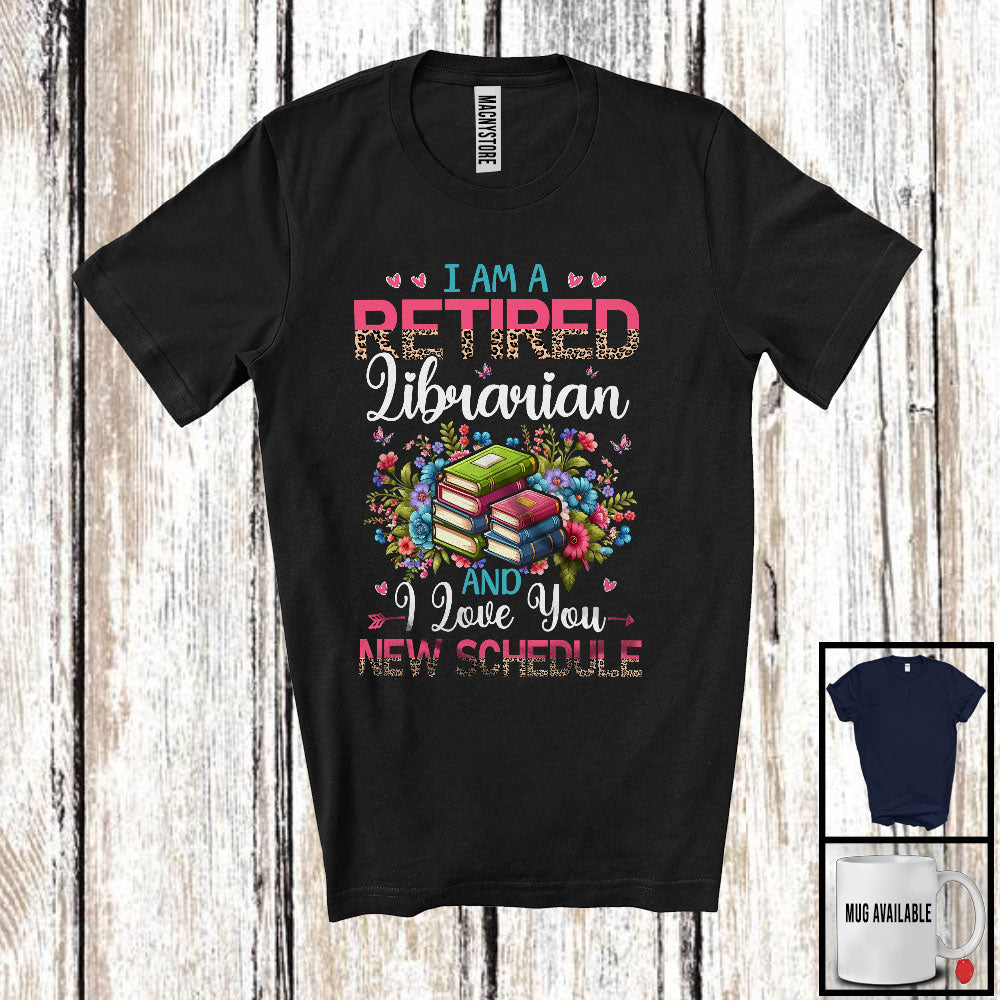 • I Am A Retired Librarian New Schedule, Floral Leopard Flowers Librarian, Retirement Group T-Shirt. This cotton t-shirt is a durable staple product with a classic fit. One of the most popular items, it has a relaxed style made for everyday and casual wear.