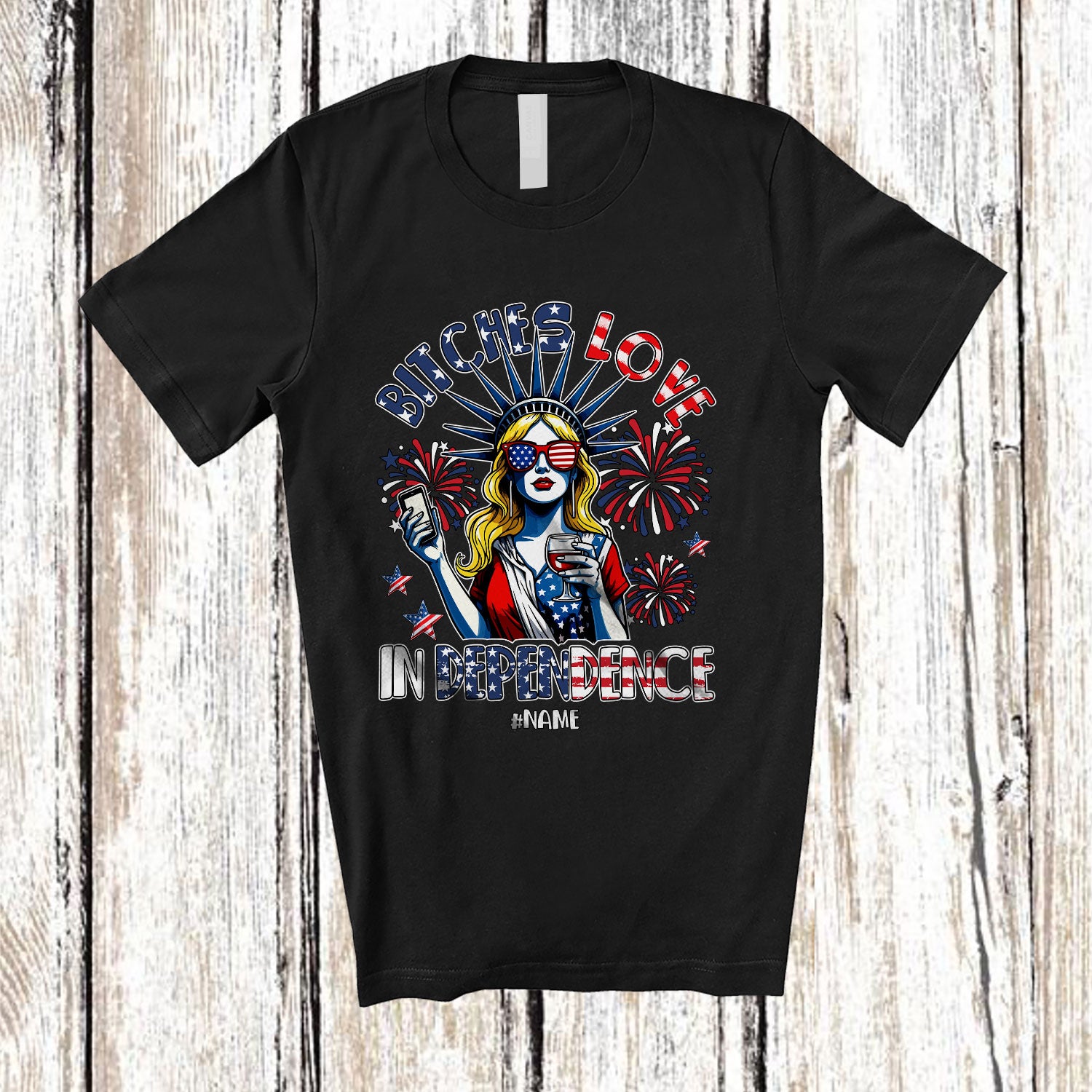 Personalized Custom Name Bitches Love In Dependence; Happy 4th Of July Women Drinking Wine T-Shirt. This cotton t-shirt is a durable staple product with a classic fit. One of the most popular items, it has a relaxed style made for everyday and casual wear.