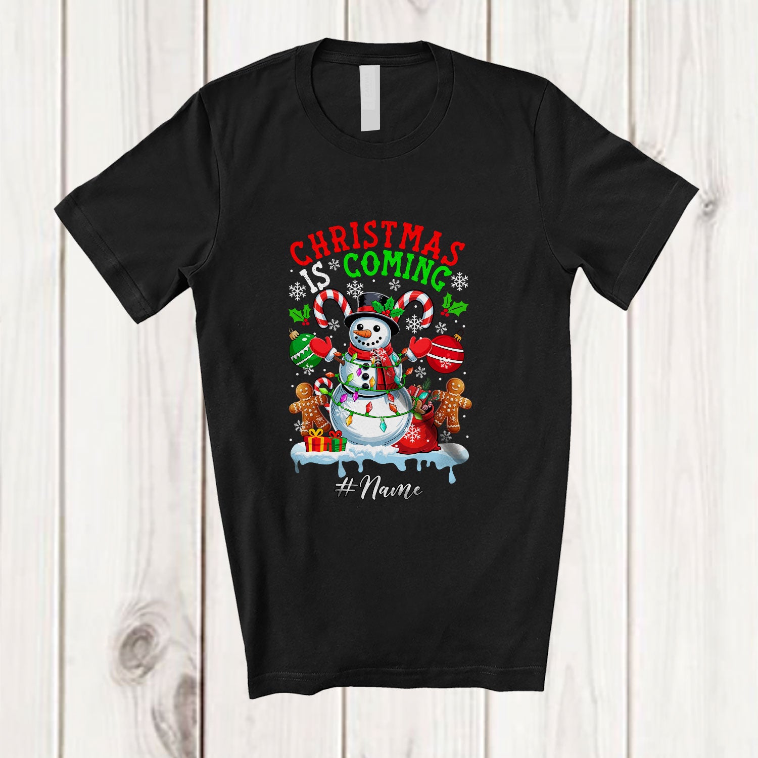 Personalized Custom Name Christmas Is Coming; Amusing X-mas Snowmen Candy Cane; Family T-Shirt. This cotton t-shirt is a durable staple product with a classic fit. One of the most popular items, it has a relaxed style made for everyday and casual wear.