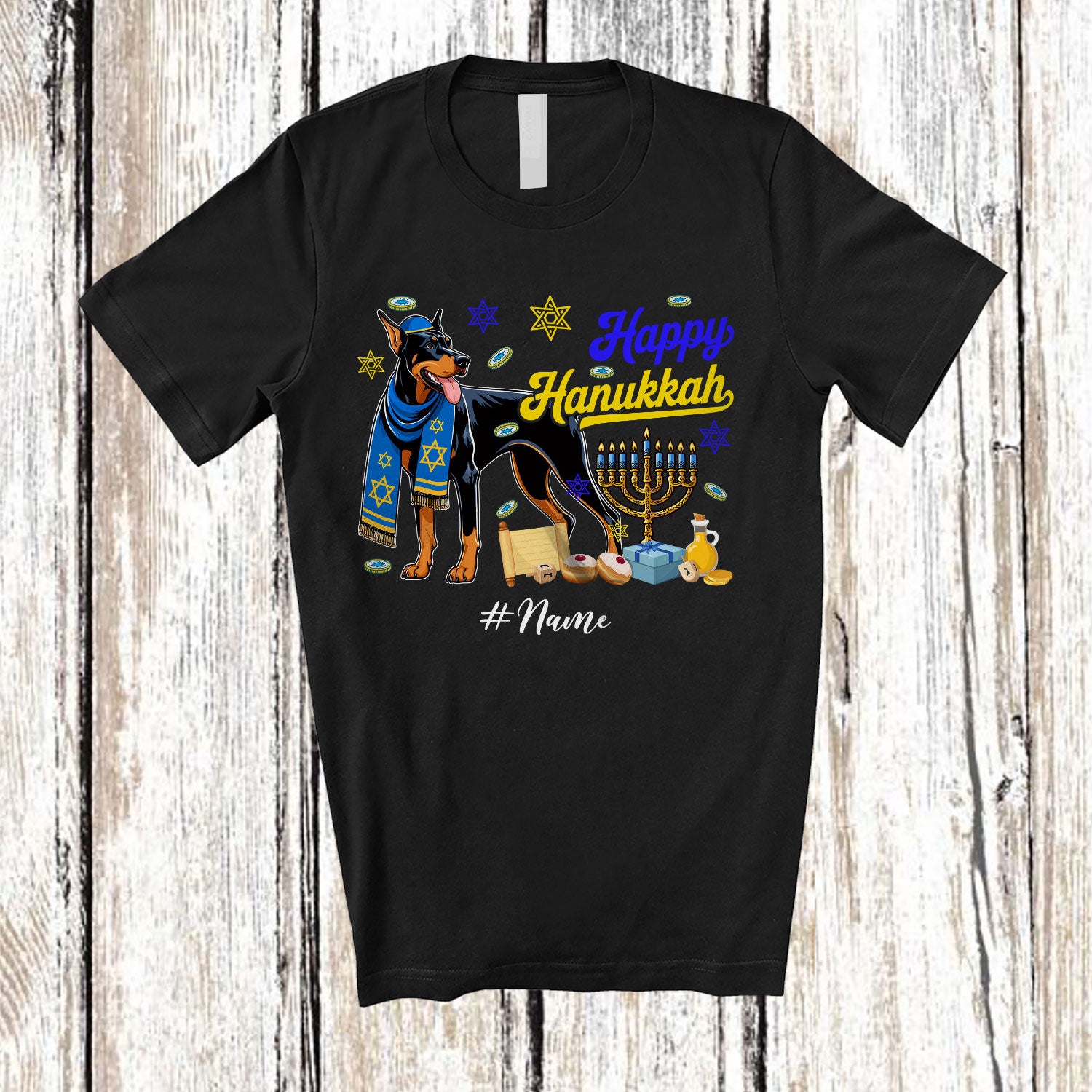 Personalized Custom Name Happy Hanukkah; Amusing Chanukah Dobermanns With Menorah Animal T-Shirt. This cotton t-shirt is a durable staple product with a classic fit. One of the most popular items, it has a relaxed style made for everyday and casual wear.