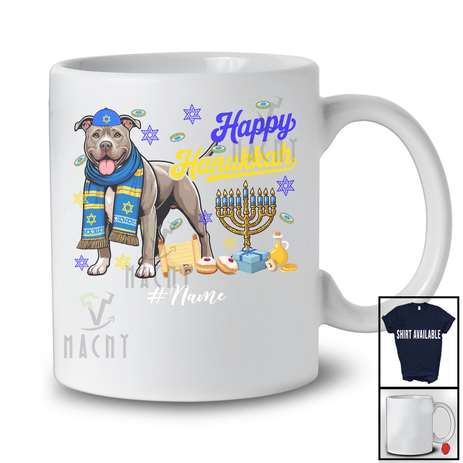 Personalized Custom Name Happy Hanukkah; Amusing Chanukah Pit Bull With Menorah Animal T-Shirt. This cotton t-shirt is a durable staple product with a classic fit. One of the most popular items, it has a relaxed style made for everyday and casual wear.