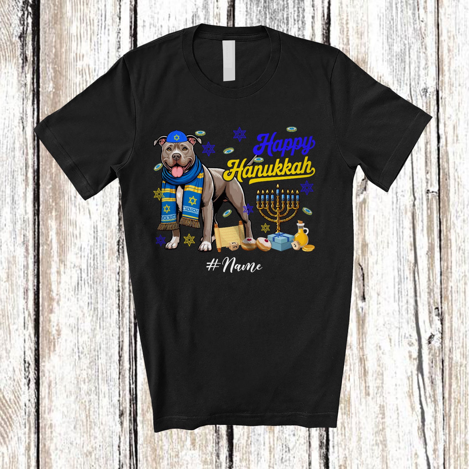 Personalized Custom Name Happy Hanukkah; Amusing Chanukah Pit Bull With Menorah Animal T-Shirt