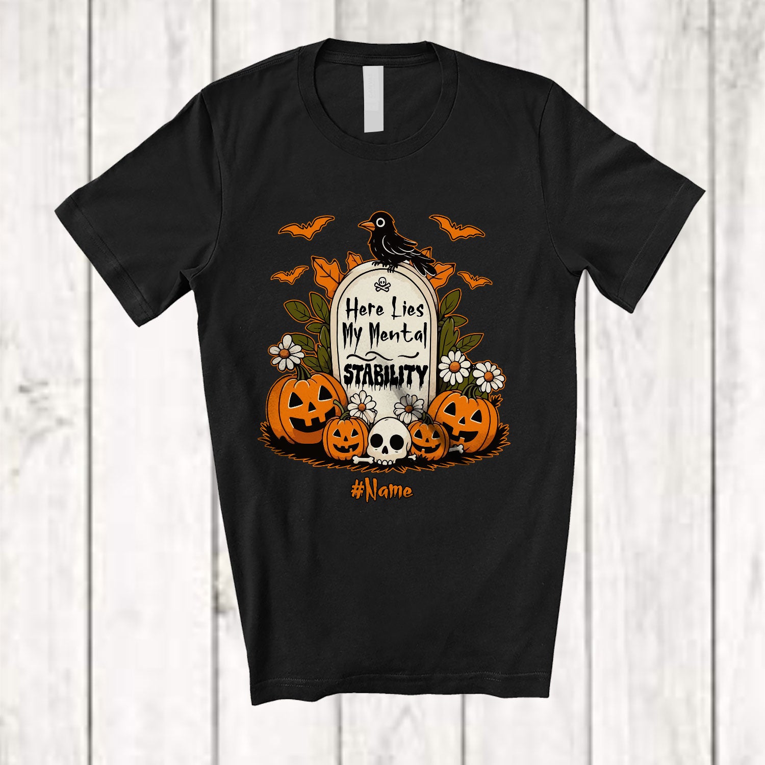 Personalized Custom Name Here Lies My Mental Stability; Humorous Halloween Pumpkins Skull T-Shirt