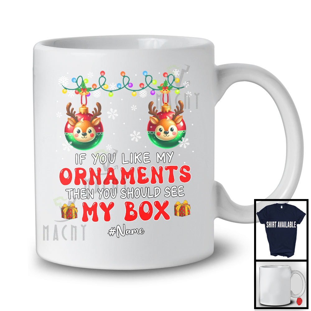 This Personalized Custom Name If Like My Ornaments See My Box; Merry Christmas Snow Two Ornaments T-Shirt is great idea gift for your family, friends in this birthday, christmas, mother's day, father's day, patrick's day or any holiday.