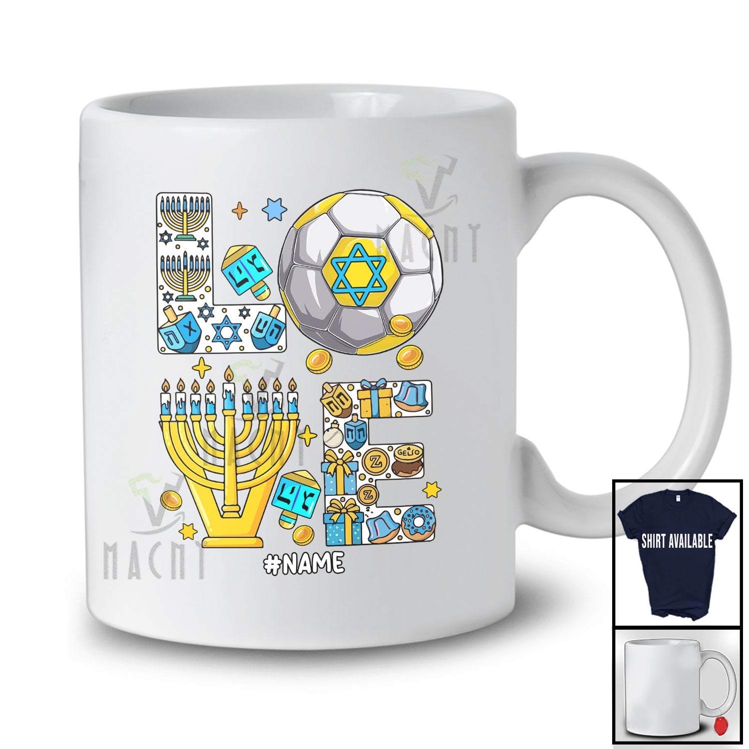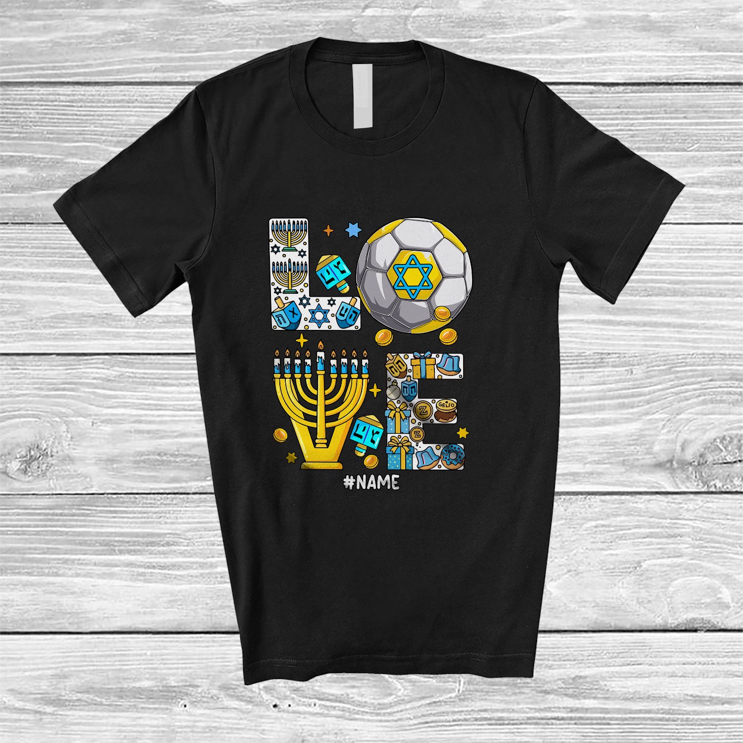 Personalized Custom Name LOVE; Lovely Hanukkah Menorah Soccer Player; Sport Playing Team T-Shirt. This cotton t-shirt is a durable staple product with a classic fit. One of the most popular items, it has a relaxed style made for everyday and casual wear.