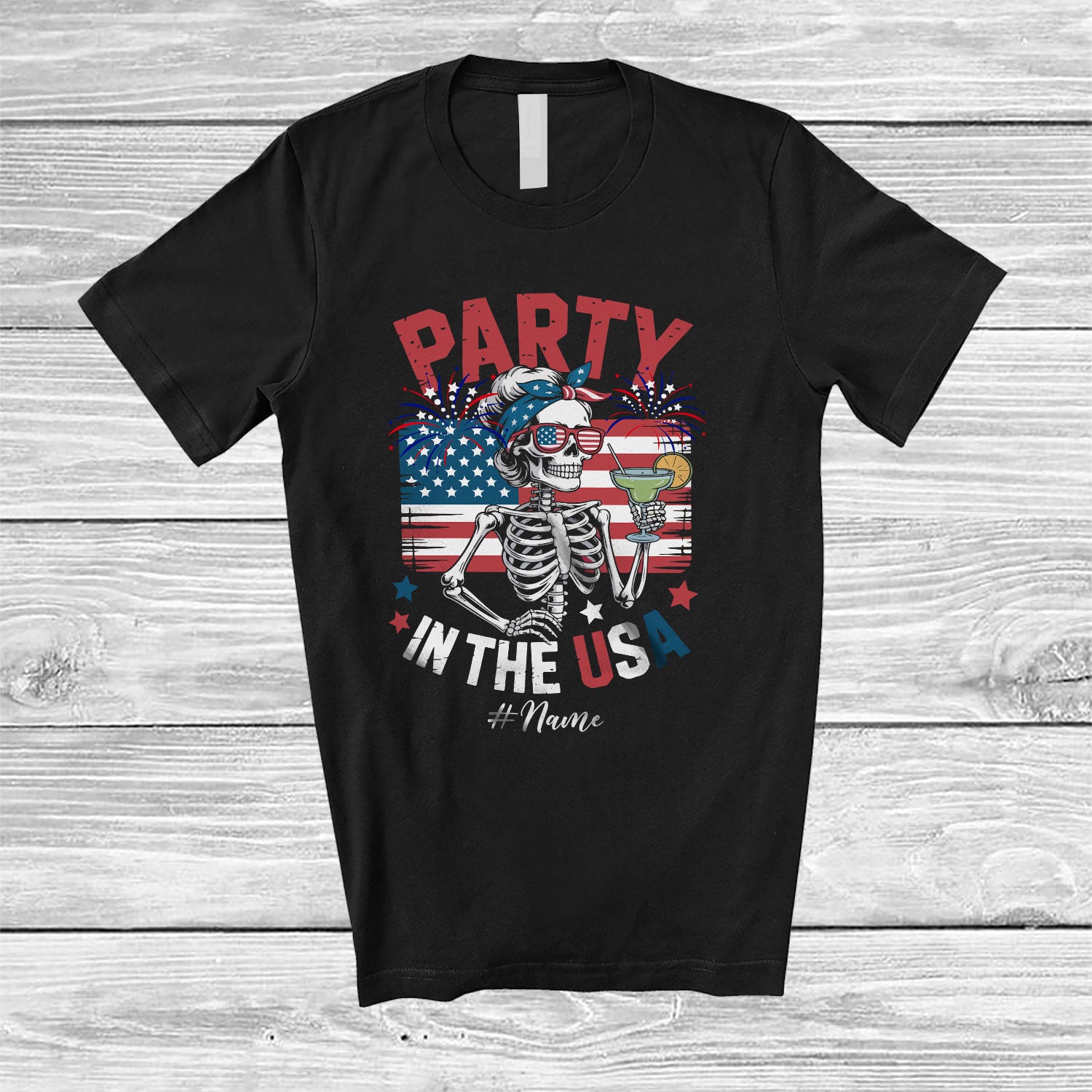 • Personalized Custom Name Party In the USA; Joyful 4th Of July US Flag Skeleton Women; Patriotic T-Shirt. This cotton t-shirt is a durable staple product with a classic fit. One of the most popular items, it has a relaxed style made for everyday and casual wear.