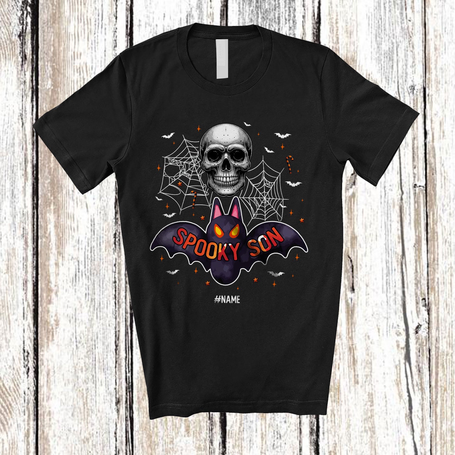 Personalized Custom Name Spooky Son; Creepy Halloween Bat Skull; Men Family Group T-Shirt. This cotton t-shirt is a durable staple product with a classic fit. One of the most popular items, it has a relaxed style made for everyday and casual wear.