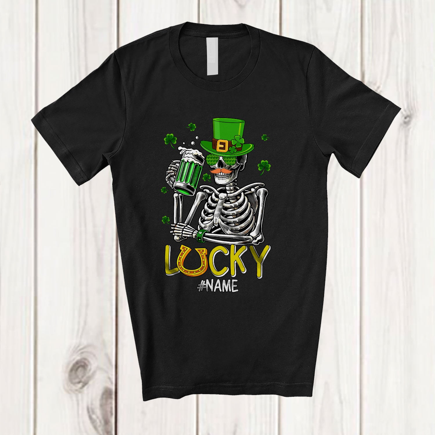 The Personalized Lucky; Awesome St. Patrick's Day Custom Name Skeleton Men Drinking Beer T-Shirt is evocative, to say the least, but that's why you're drawn to it in the first place.
