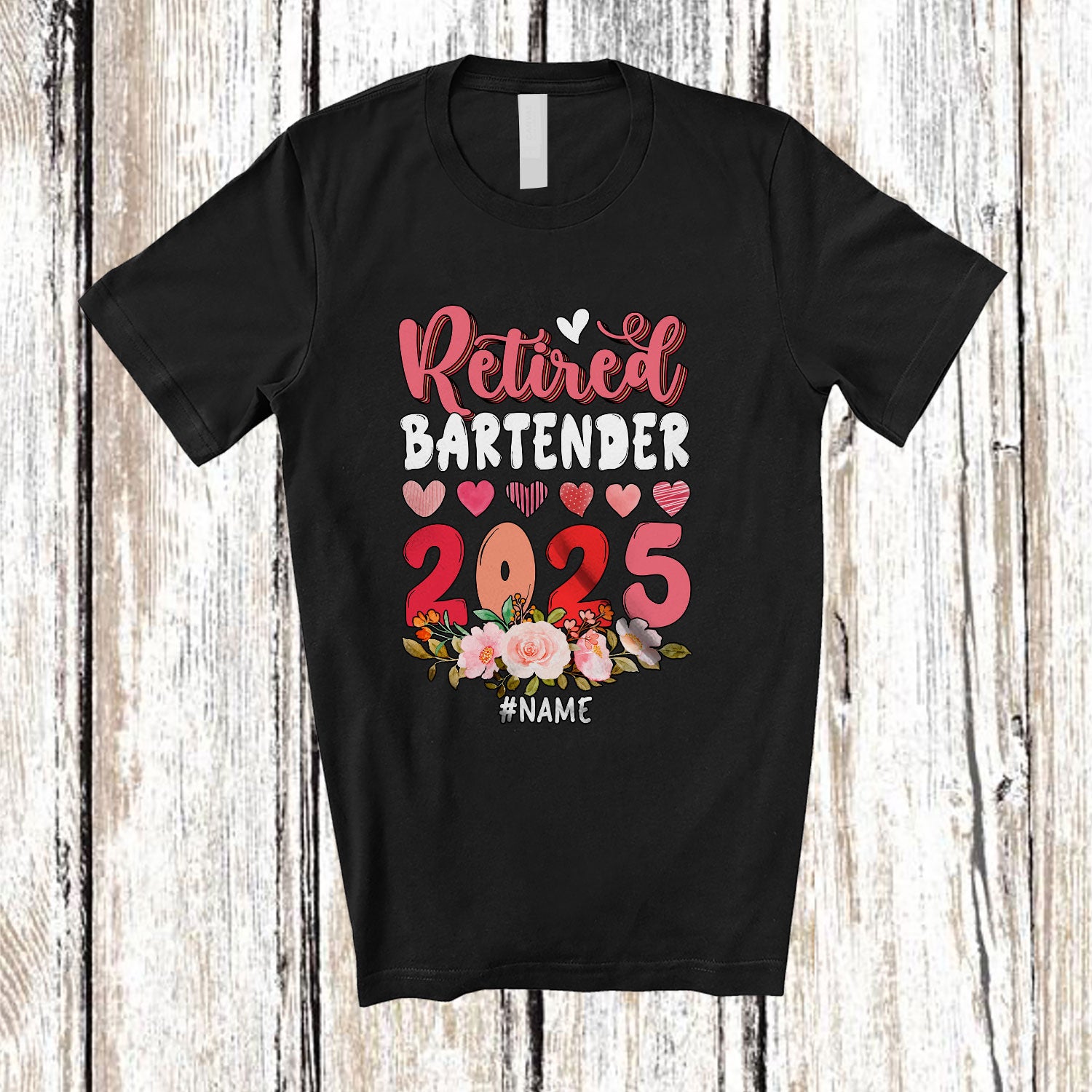 Personalized Retired Bartender 2025; Floral Retirement Flowers; Custom Name Jobs Family T-Shirt