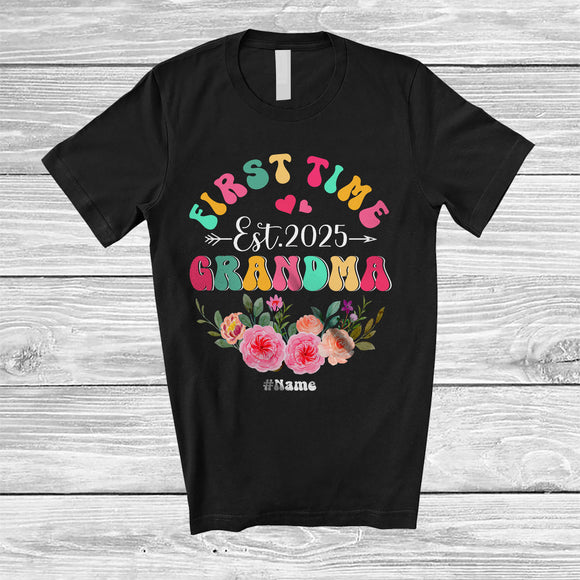 Personalized Custom Name First Time Grandma Est. 2025; Lovely Mother's Day Pregnancy Flowers T-Shirt