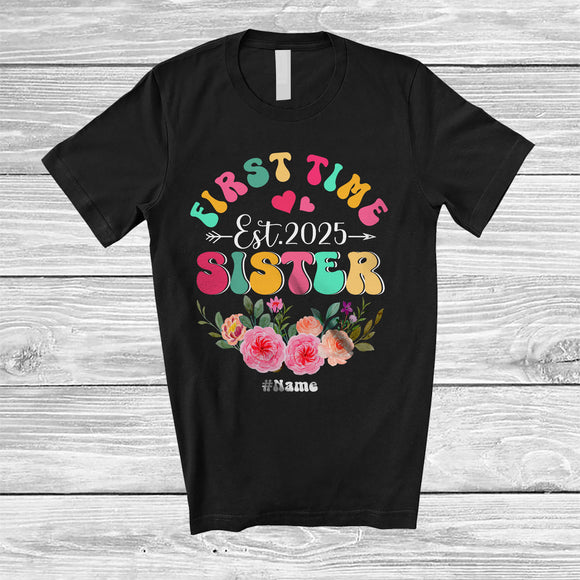 Personalized Custom Name First Time Sister Est. 2025; Lovely Mother's Day Pregnancy Flowers T-Shirt