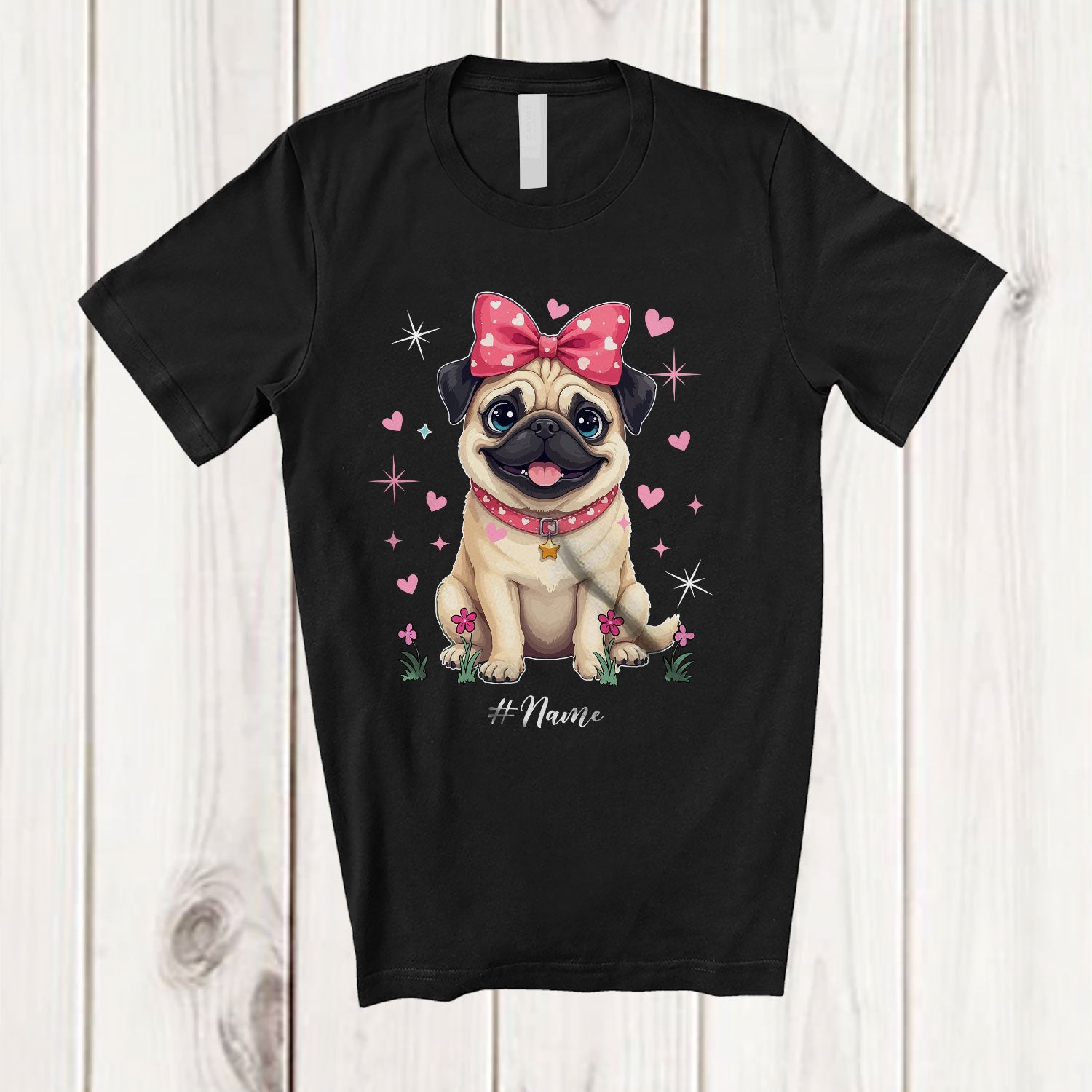 • Personalized Custom Name Coquette Bow Pug; Lovely Mother's Day Pinks Hearts T-Shirt. This cotton t-shirt is a durable staple product with a classic fit. One of the most popular items, it has a relaxed style made for everyday and casual wear.