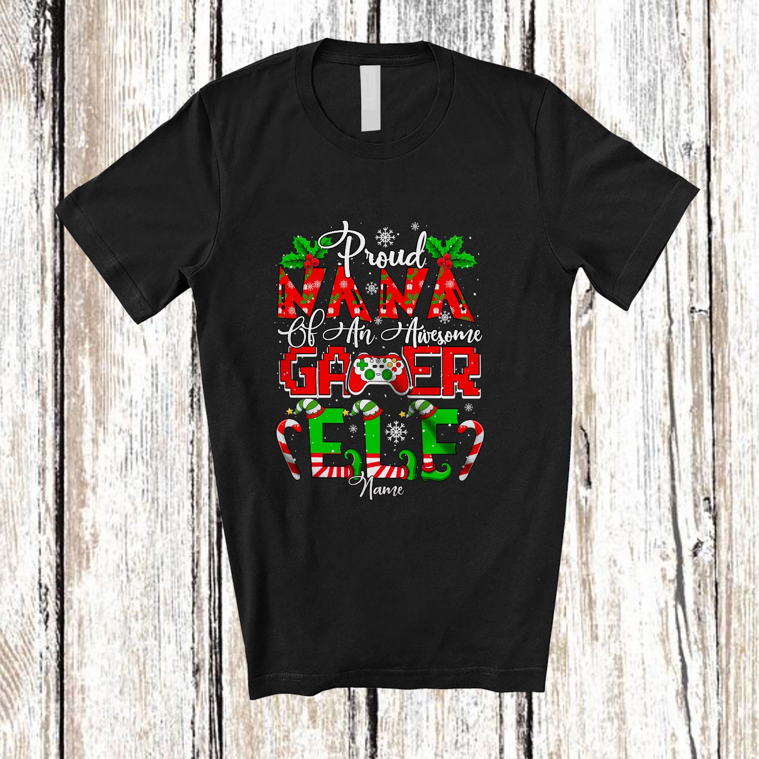 Personalized Custom Name Proud Nana Of Gamer Elf; Joyful Christmas Mother's Day Family T-Shirt. This cotton t-shirt is a durable staple product with a classic fit. One of the most popular items, it has a relaxed style made for everyday and casual wear.