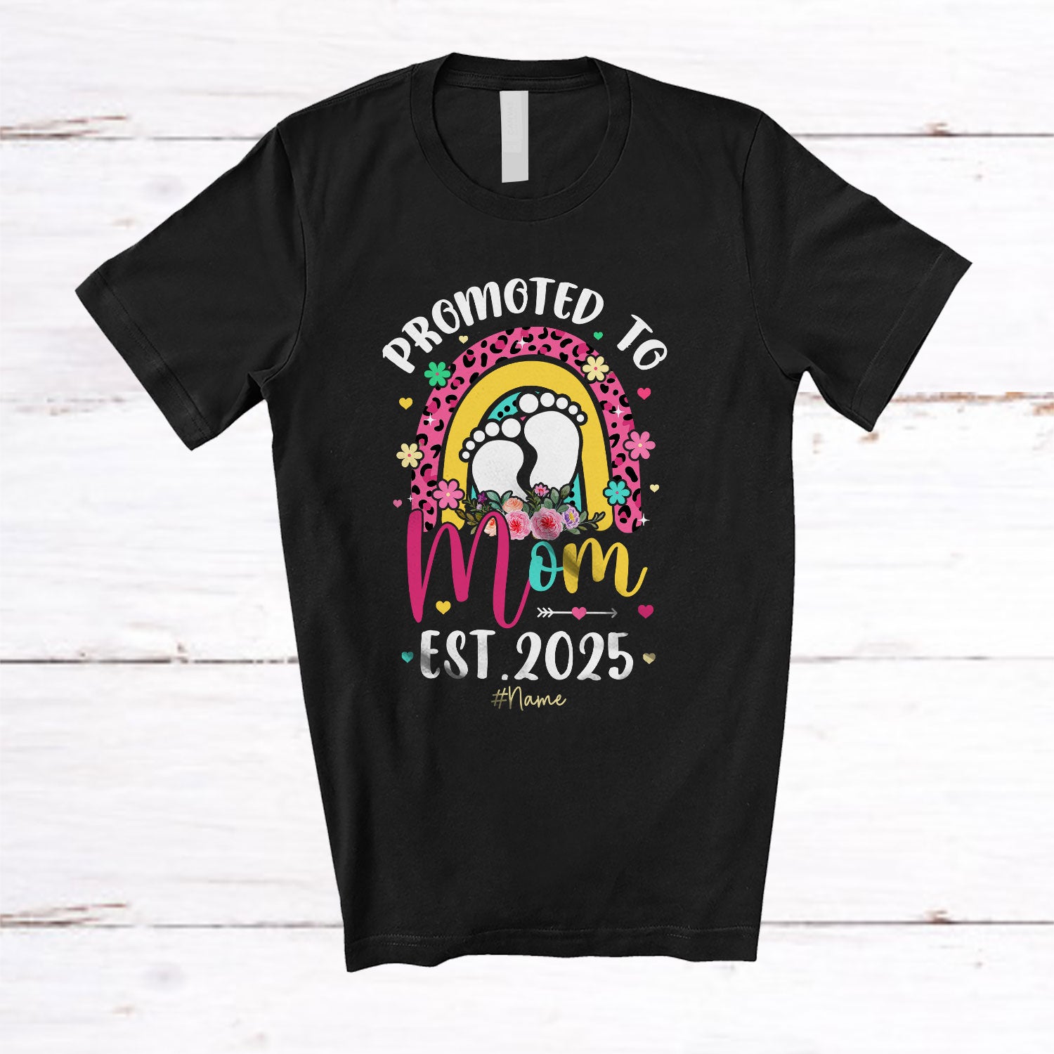 Personalized Promoted To Mom Est 2025; Lovely Pregnancy Leopard Rainbow; Custom Name Family T-Shirt