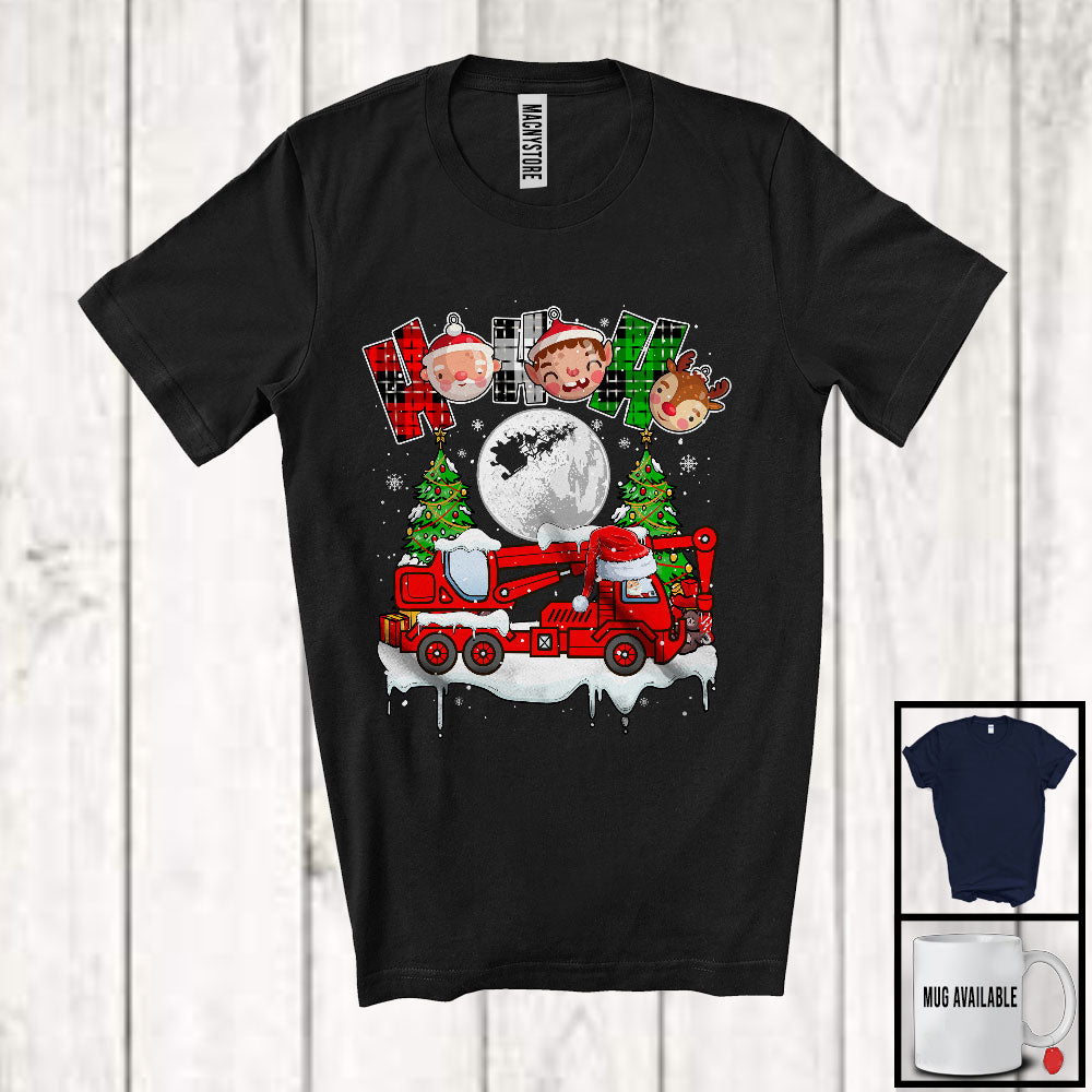 3Ho; Amazing Christmas Plaid Santa Driving Crane Truck Driver; X-mas Moon Tree Snowing T-Shirt. This cotton t-shirt is a durable staple product with a classic fit. One of the most popular items, it has a relaxed style made for everyday and casual wear.