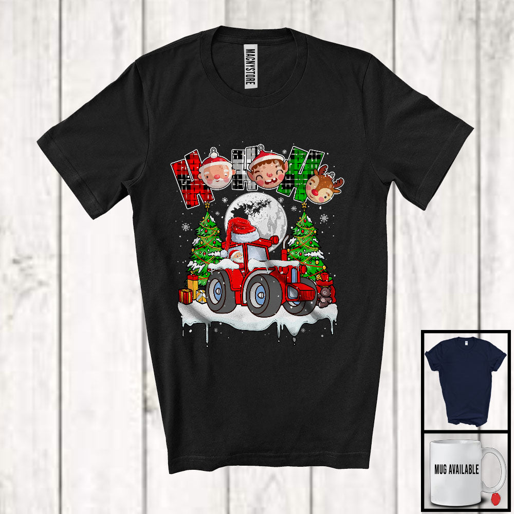 new MacnyStore - 3Ho; Amazing Christmas Plaid Santa Driving Tractor Driver Farmer; X-mas Moon Tree Snowing T-Shirt – Macnystore