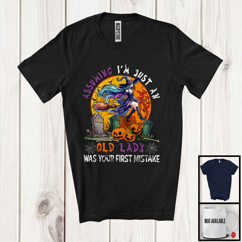 Assuming I'm Just An Old Lady Was Your First Mistake; Scary Halloween Moon Witch Lover T-Shirt. This cotton t-shirt is a durable staple product with a classic fit. One of the most popular items, it has a relaxed style made for everyday and casual wear.