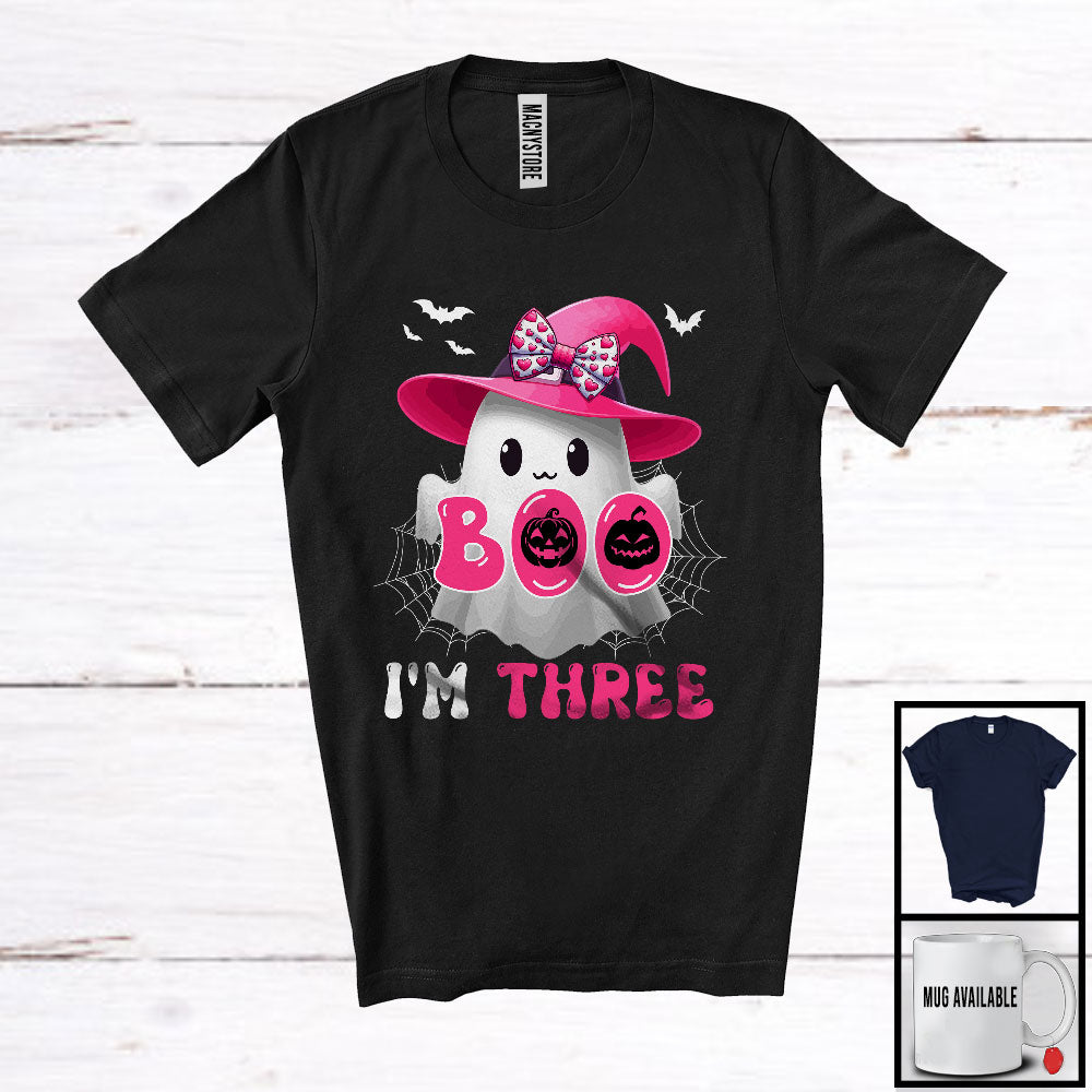 Boo I'm Three; Adorable 3rd Birthday Halloween Costume Pink Boo Ghost Witch; Family Group T-Shirt. This cotton t-shirt is a durable staple product with a classic fit. One of the most popular items, it has a relaxed style made for everyday and casual wear.