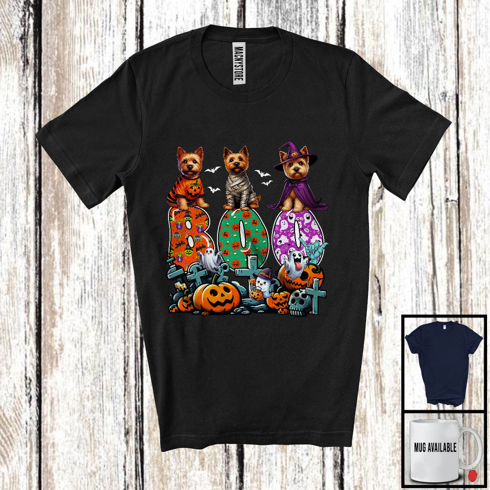 Boo; Spooky Halloween Three Pumpkin Mummy Witch Norwich Terriers Owner; Family Group T-Shirt. This cotton t-shirt is a durable staple product with a classic fit. One of the most popular items, it has a relaxed style made for everyday and casual wear.