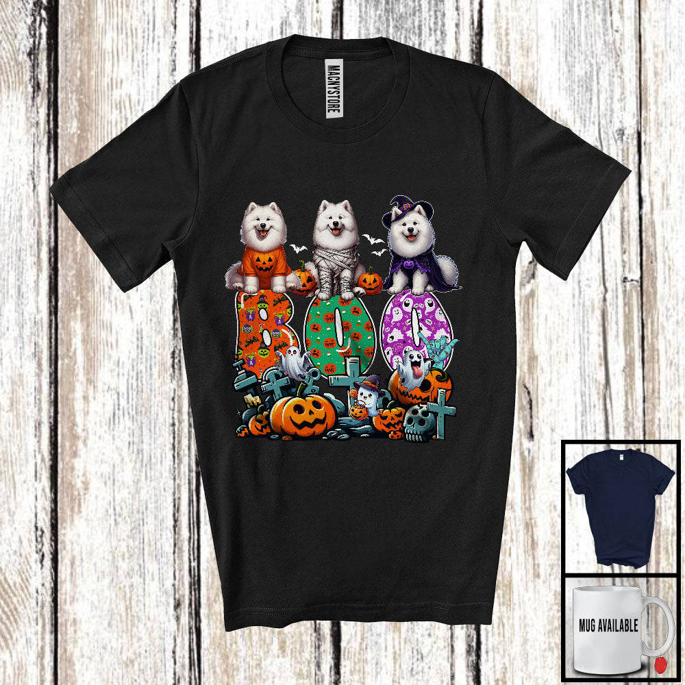 new MacnyStore - Boo; Spooky Halloween Three Pumpkin Mummy Witch Samoyeds Owner; Family Group T-Shirt – Macnystore