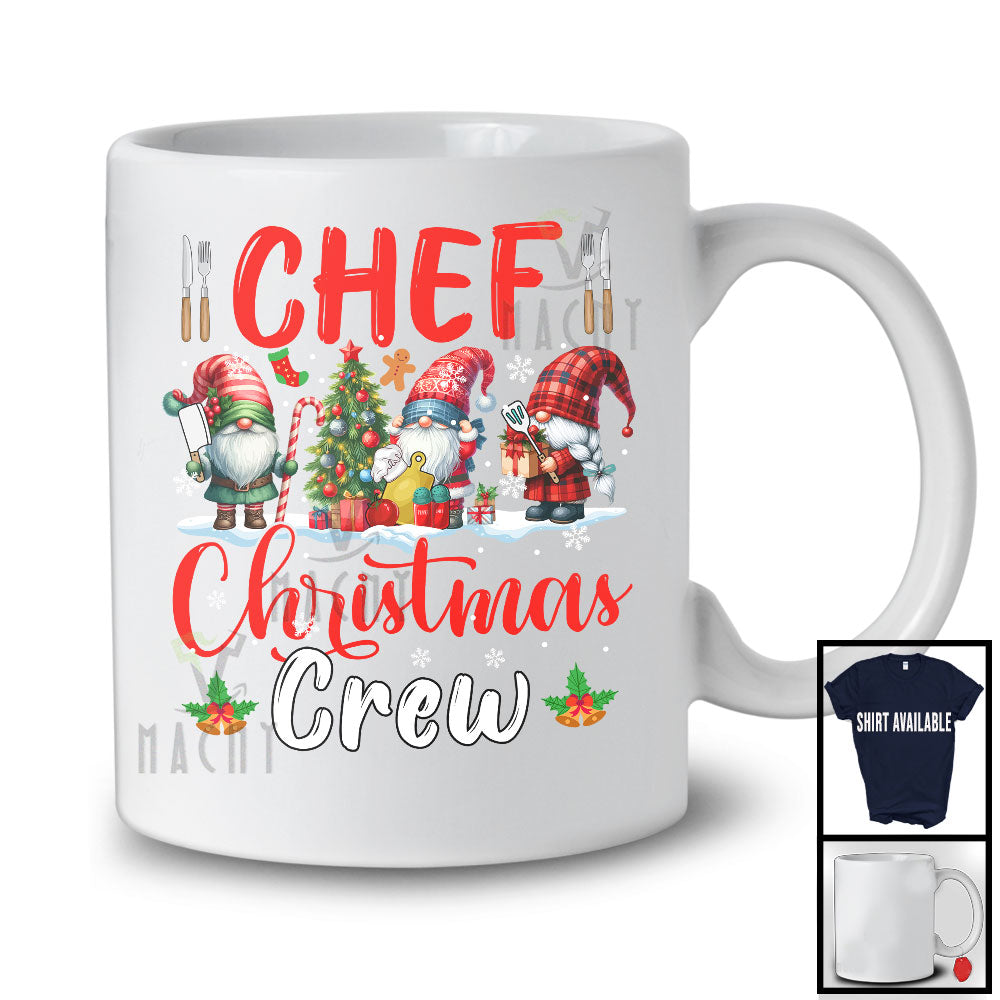 • Chef Christmas Crew; Adorable X-mas Tree Three Gnomes; Snowing Chef Group T-Shirt. This cotton t-shirt is a durable staple product with a classic fit. One of the most popular items, it has a relaxed style made for everyday and casual wear.