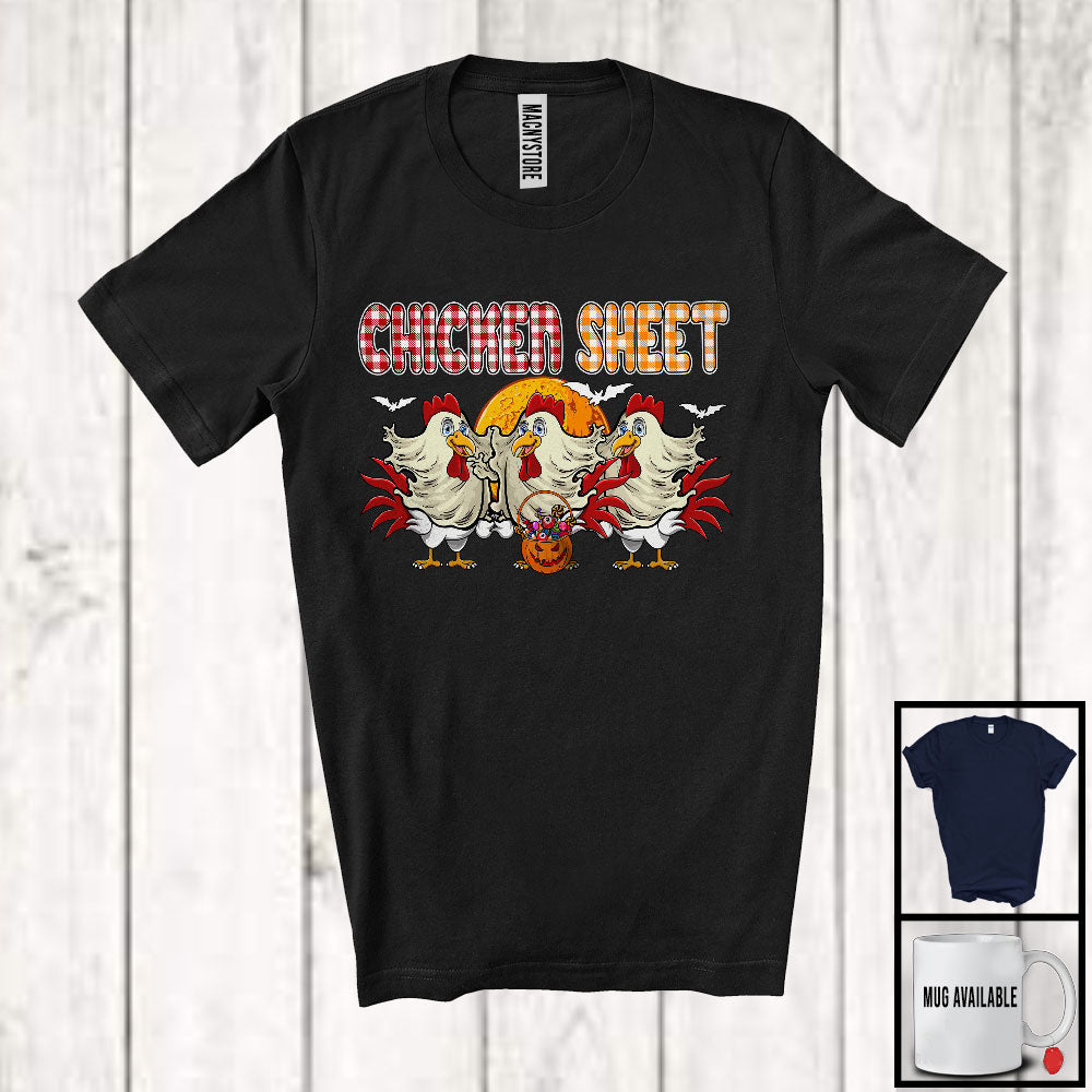 Chicken Sheet; Awesome Halloween Costume Plaid Four Chickens Boo Ghost; Farmer T-Shirt. This cotton t-shirt is a durable staple product with a classic fit. One of the most popular items, it has a relaxed style made for everyday and casual wear.