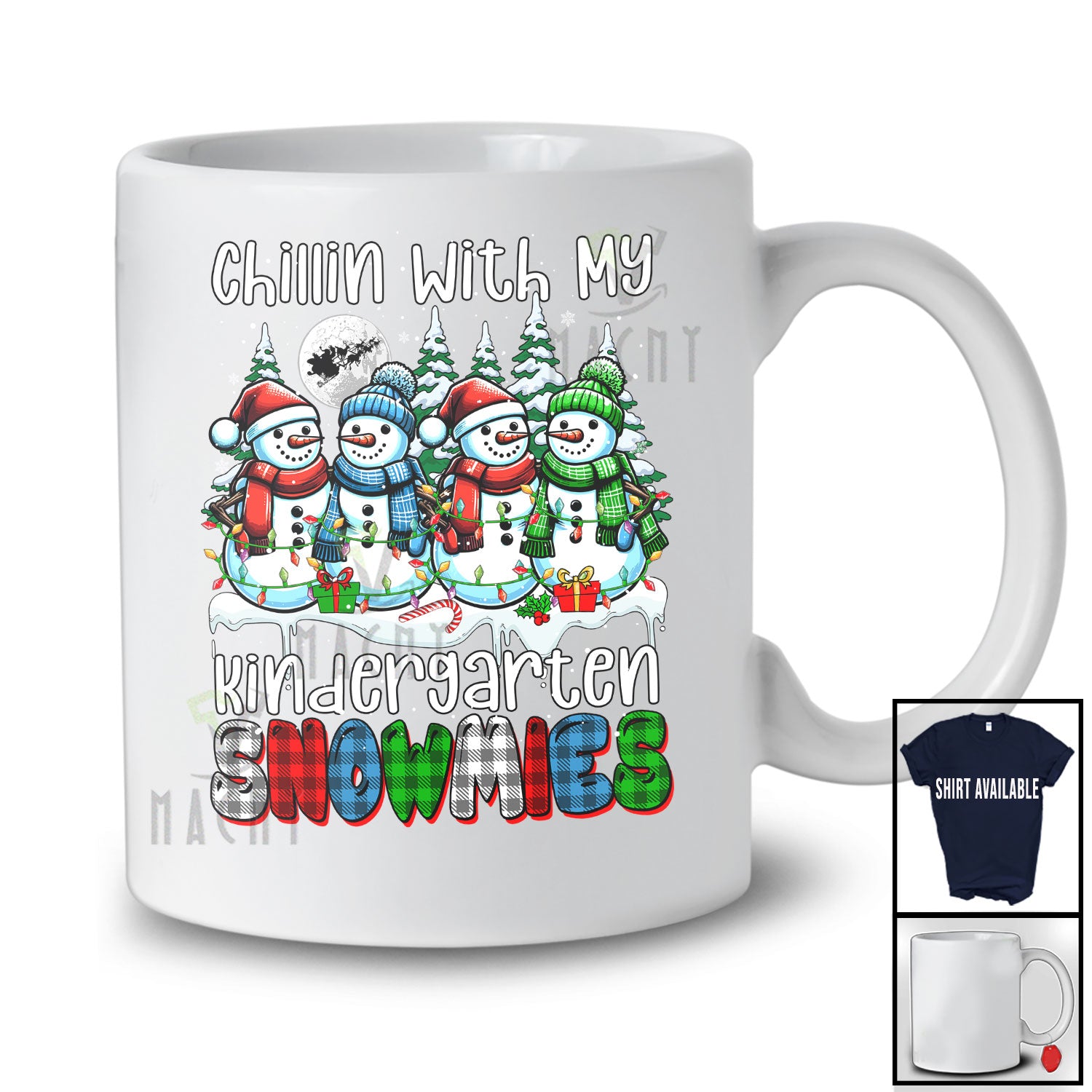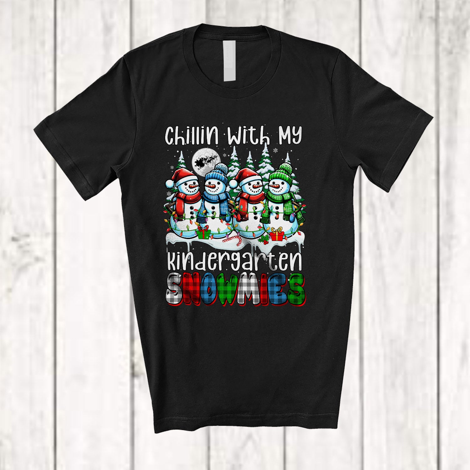 • Chillin' With My Kindergarten Snowmies; Amusing Christmas Plaid Four Snowman; Teacher Family T-Shirt. This cotton t-shirt is a durable staple product with a classic fit. One of the most popular items, it has a relaxed style made for everyday and casual wear.