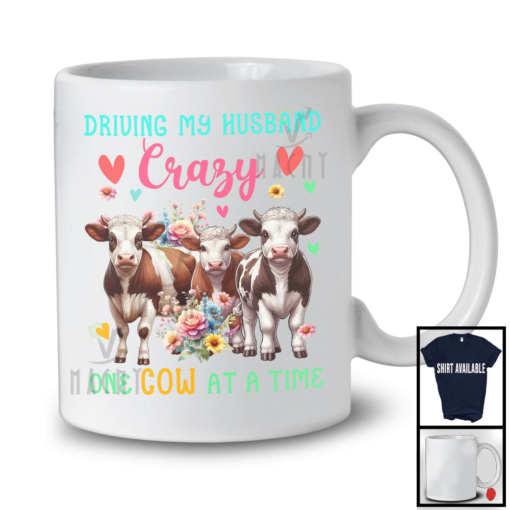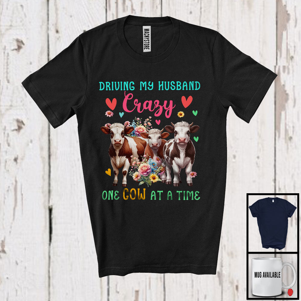 This Driving My Husband Crazy One Cow; Humorous Three Flowers Cow; Floral Farm Farmer T-Shirt is great idea gift for your family, friends in this birthday, christmas, mother's day, father's day, patrick's day or any holiday.