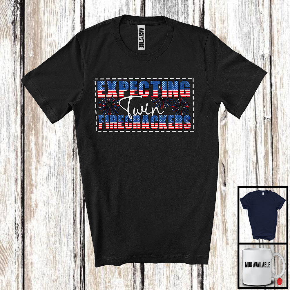 • Expecting Twin Firecrackers, Joyful 4th Of July American Flag, Pregnancy Patriotic Fireworks T-Shirt. This cotton t-shirt is a durable staple product with a classic fit. One of the most popular items, it has a relaxed style made for everyday and casual wear.