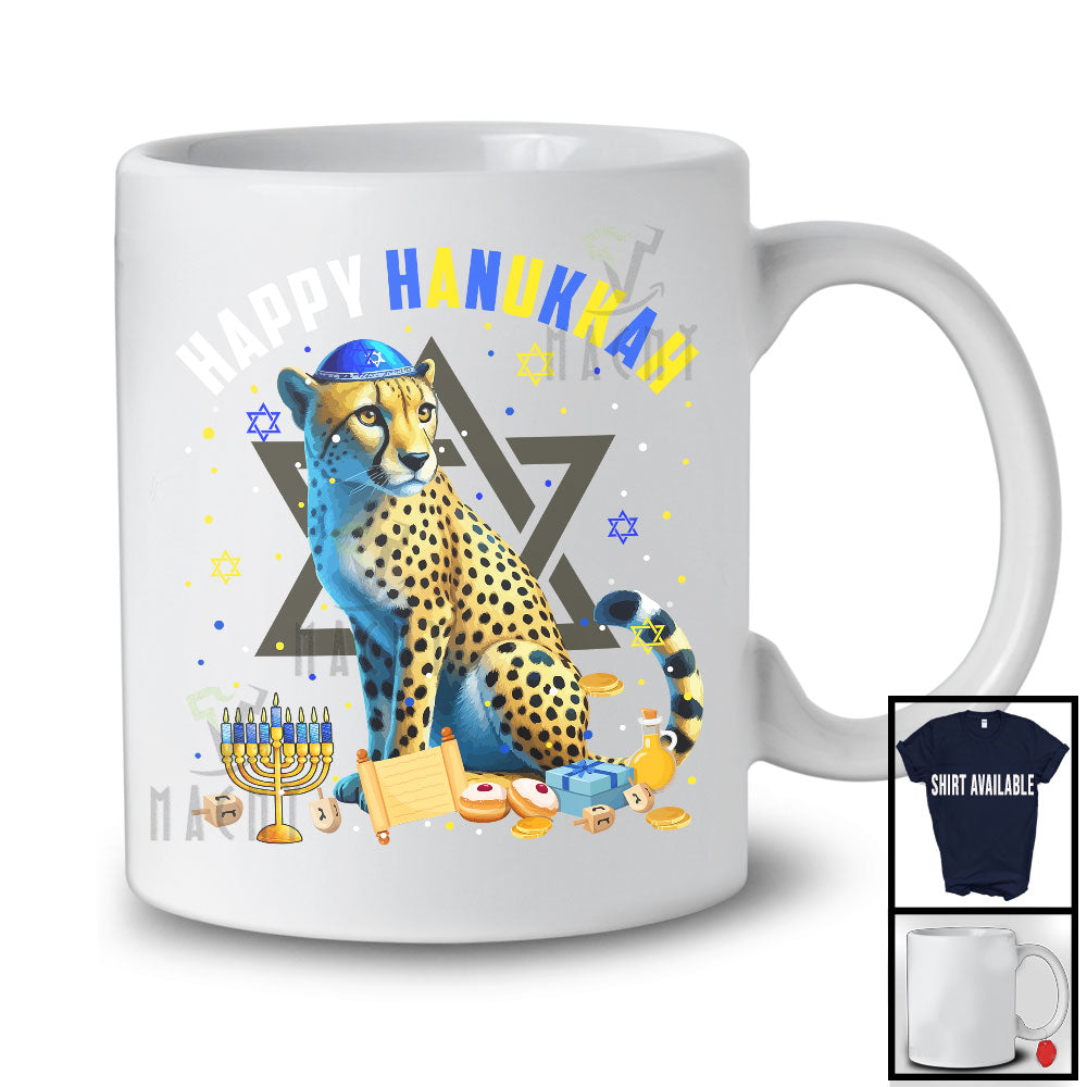 • Happy Hanukkah; Lovely Chanukah Cheetah Wearing Kippah; Wild Animal Lover Menorah Family T-Shirt. This cotton t-shirt is a durable staple product with a classic fit. One of the most popular items, it has a relaxed style made for everyday and casual wear.