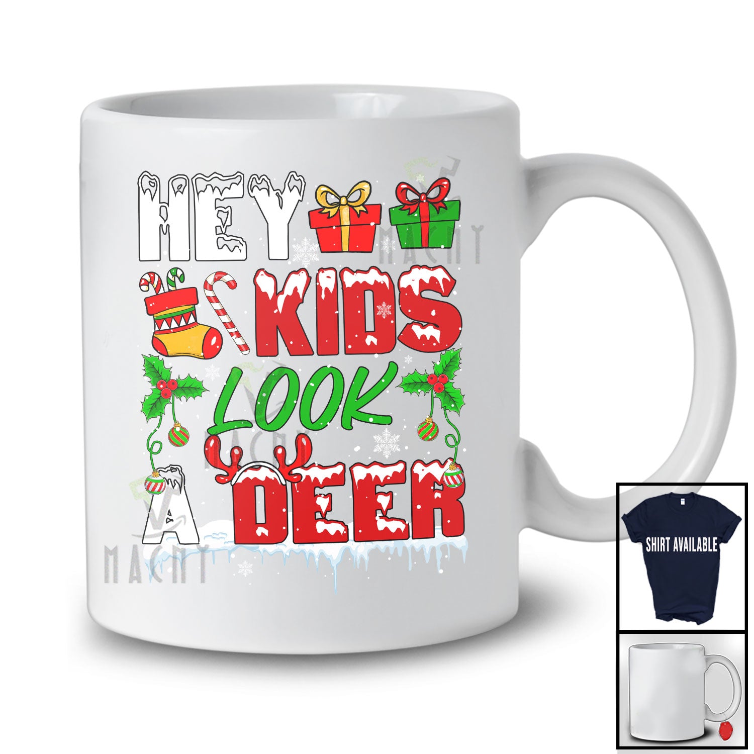 Hey Kids Look A Deer; Awesome Christmas Deer Hunting Lover; Snowing Family Group T-Shirt. This cotton t-shirt is a durable staple product with a classic fit. One of the most popular items, it has a relaxed style made for everyday and casual wear.