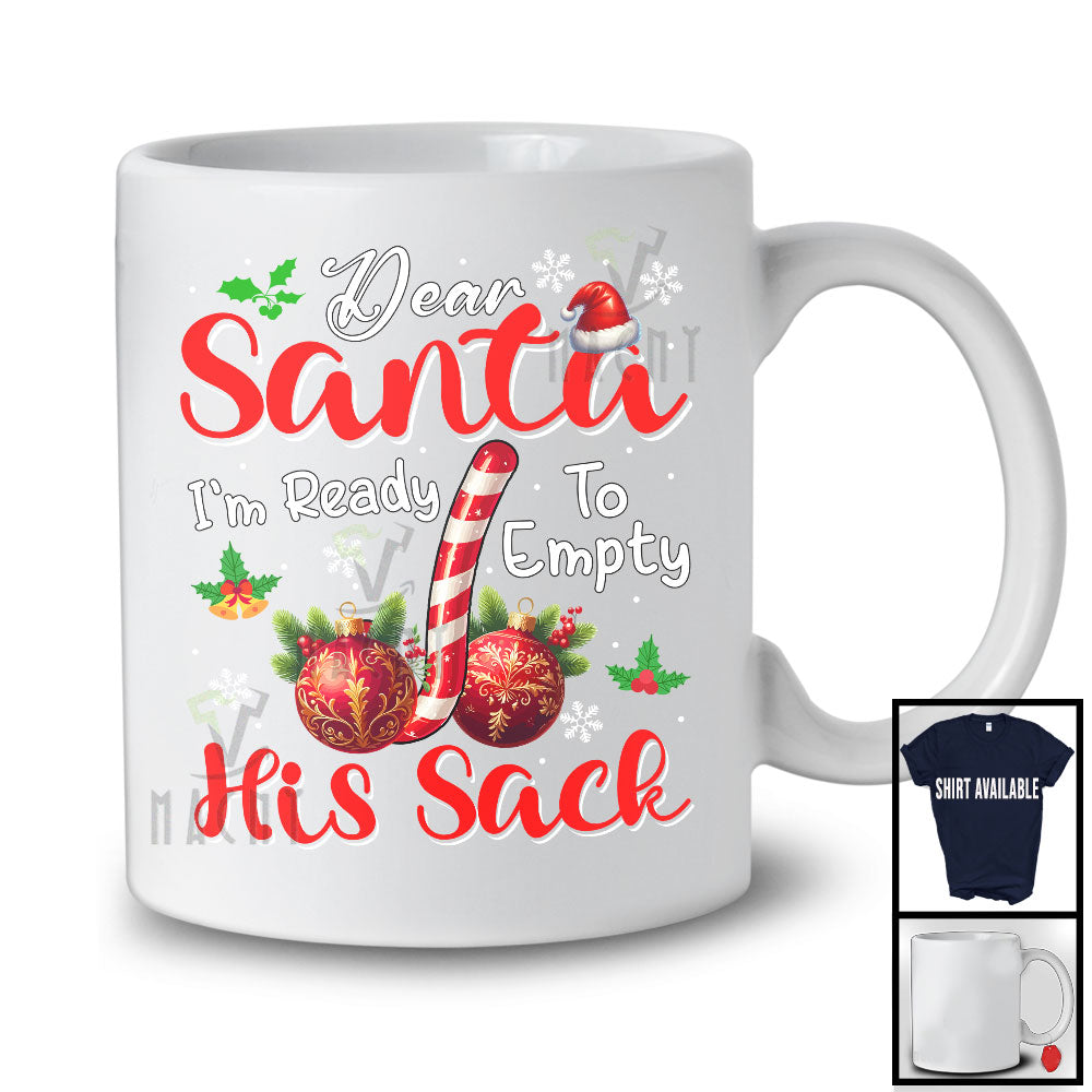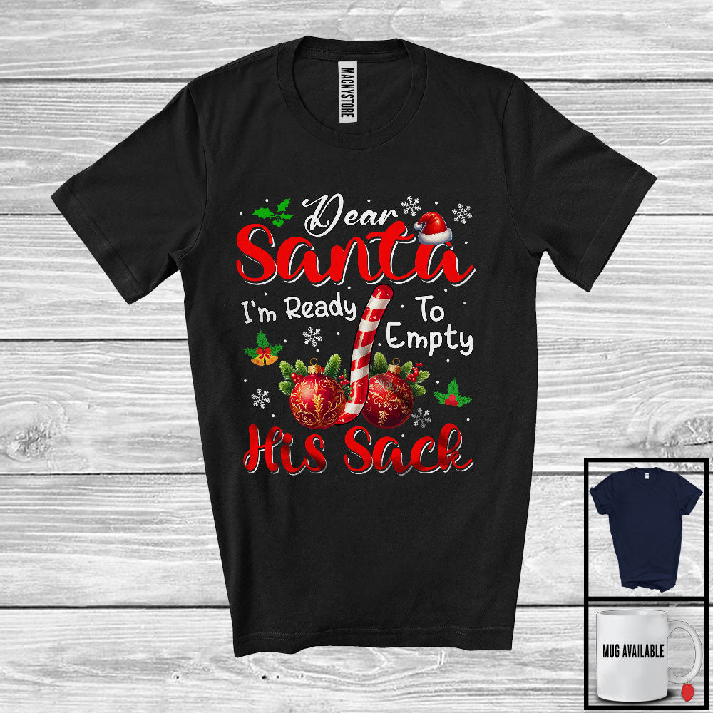 I'm Ready To Empty His Sack; Sarcastic Christmas Candy Cane Ornaments; Snowing Family T-Shirt. This cotton t-shirt is a durable staple product with a classic fit. One of the most popular items, it has a relaxed style made for everyday and casual wear.