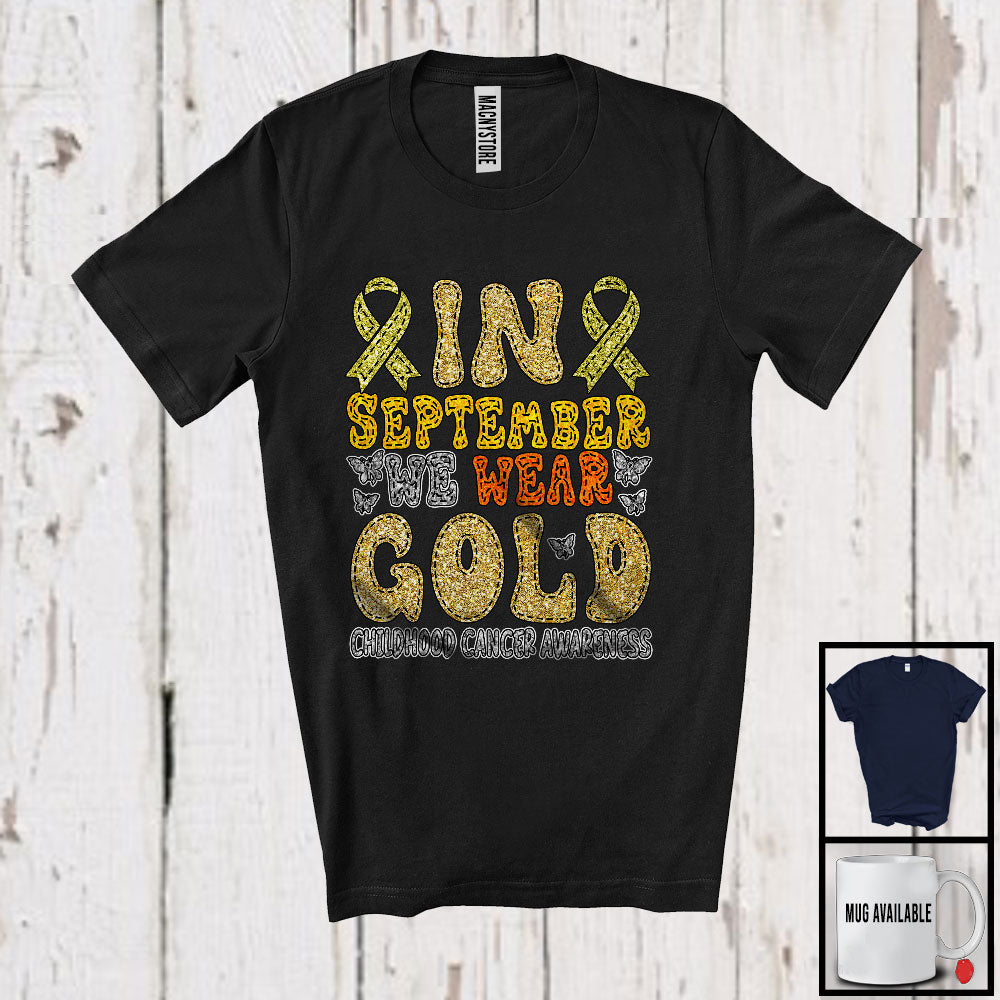 In September We Wear Gold; Lovely Childhood Cancer Awareness Gold Ribbon Butterfly; Family T-Shirt. This cotton t-shirt is a durable staple product with a classic fit. One of the most popular items, it has a relaxed style made for everyday and casual wear.