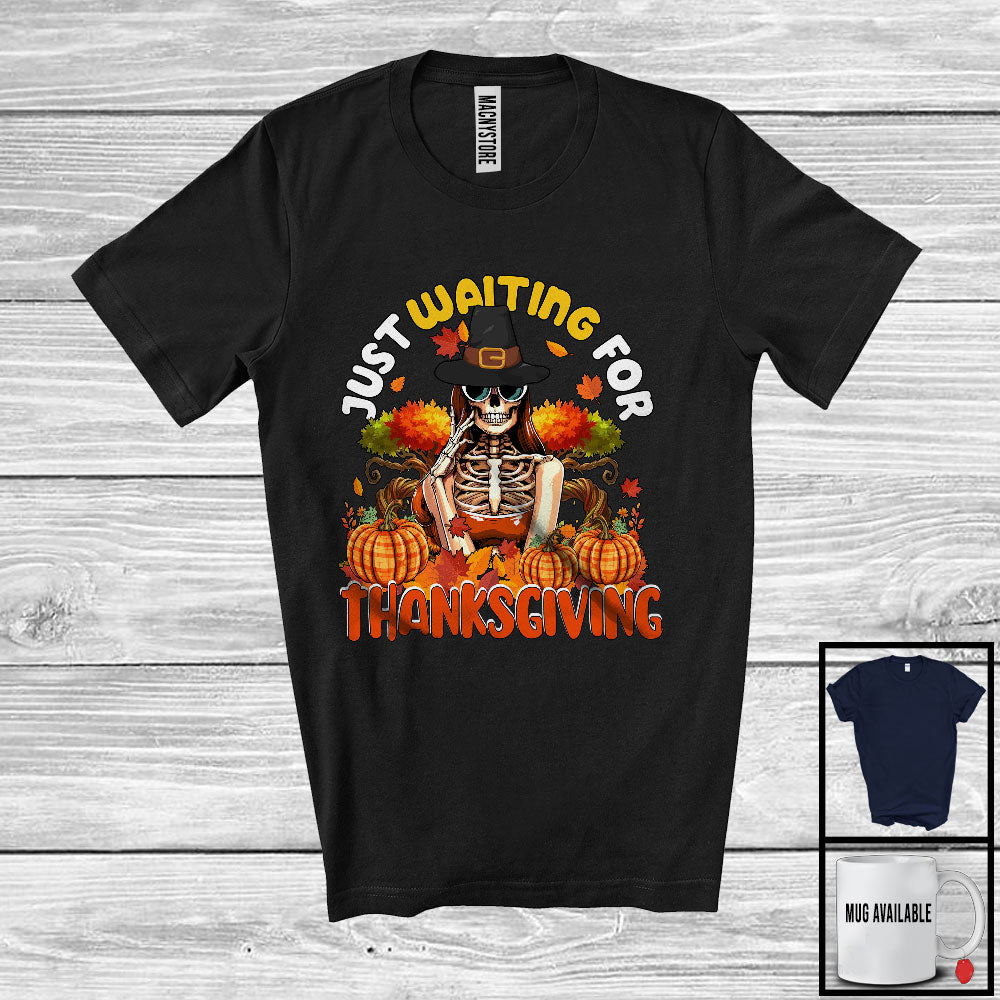Just Waiting For Thanksgiving; Humorous Pilgrim Skeleton Lover; Fall Leaves Plaid Pumpkins T-Shirt. This cotton t-shirt is a durable staple product with a classic fit. One of the most popular items, it has a relaxed style made for everyday and casual wear.