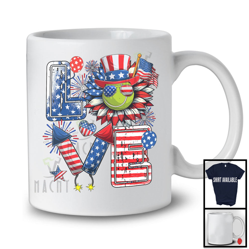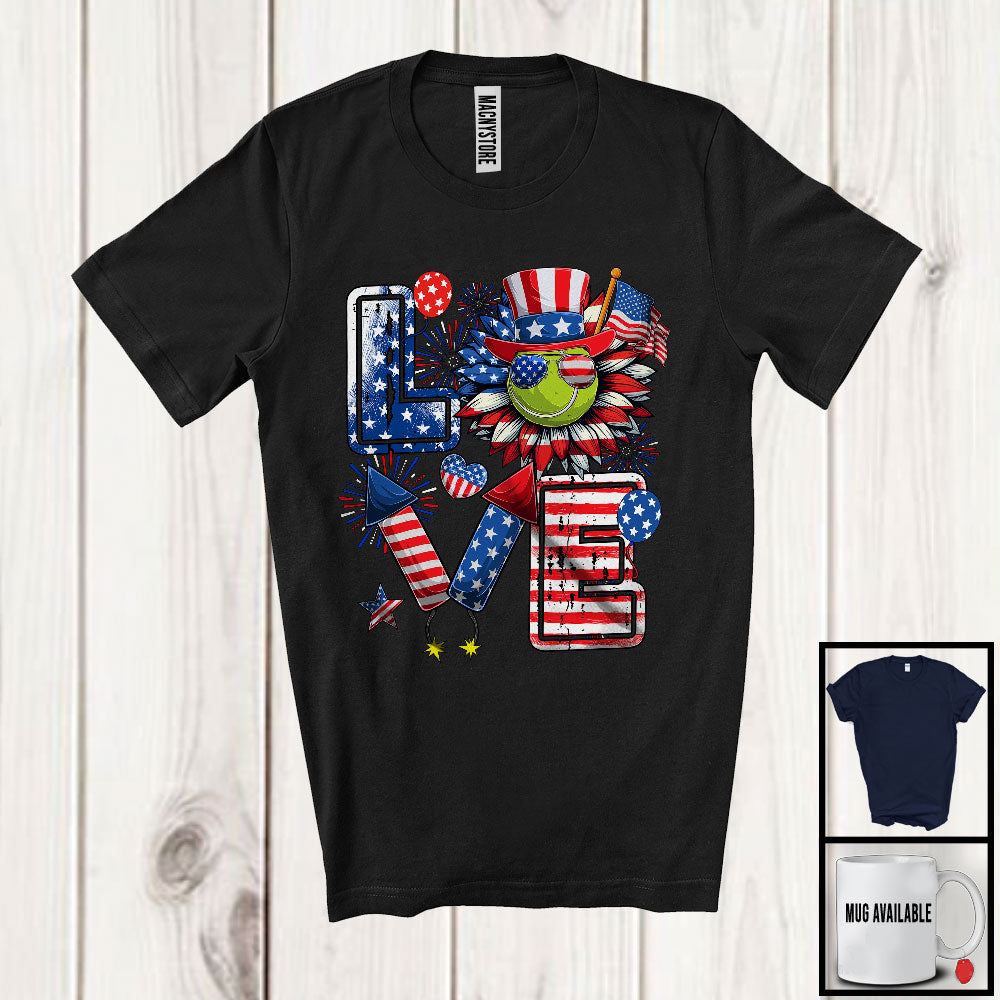 LOVE, Amazing 4th Of July Tennis Sport Player Team, American Flag Sunflower Fireworks T-Shirt