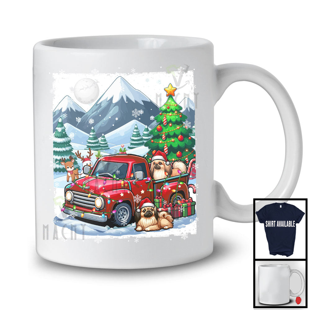 Lovely Santa Pekingese With Red Pickup Truck; Cool Christmas Tree Lights; Winter Snowing T-Shirt
