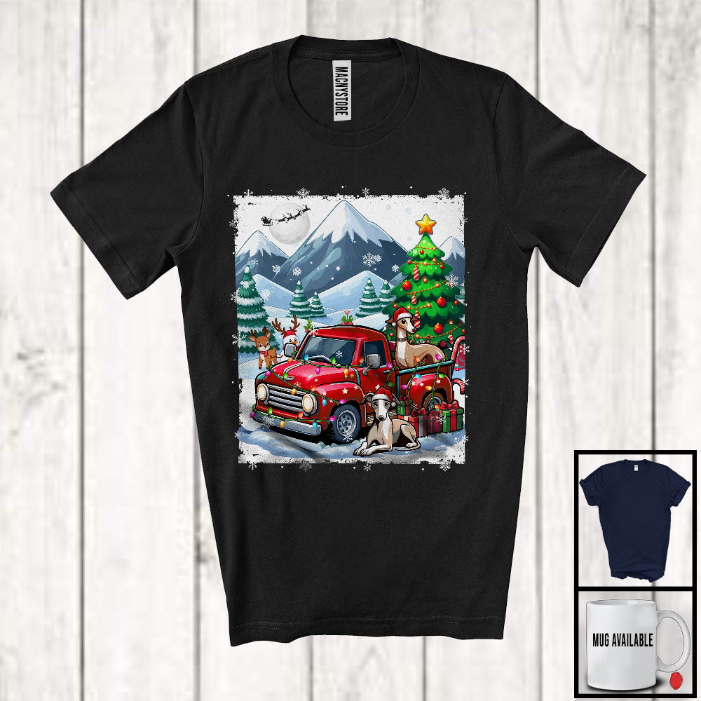 Lovely Santa Whippet With Red Pickup Truck; Cool Christmas Tree Lights; Winter Snowing T-Shirt