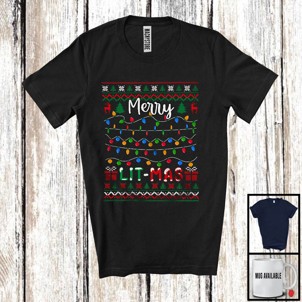 Merry Lit-mas; Amazing Christmas Lights Snowing Around; X-mas Sweater Family Lover Group T-Shirt. This cotton t-shirt is a durable staple product with a classic fit. One of the most popular items, it has a relaxed style made for everyday and casual wear.