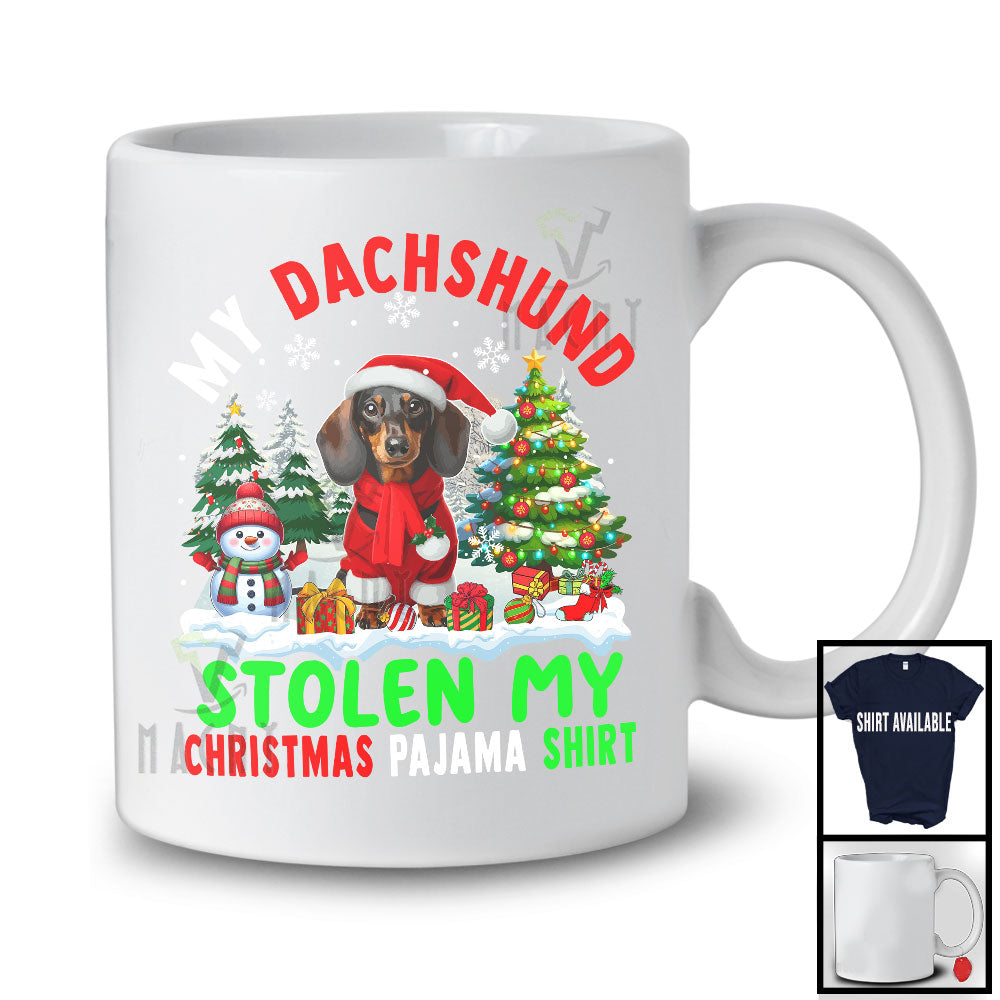 • My Dachshund Stolen My Christmas Pajama Shirt; Amazing X-mas Tree Snowing; Family Group T-Shirt. This cotton t-shirt is a durable staple product with a classic fit. One of the most popular items, it has a relaxed style made for everyday and casual wear.