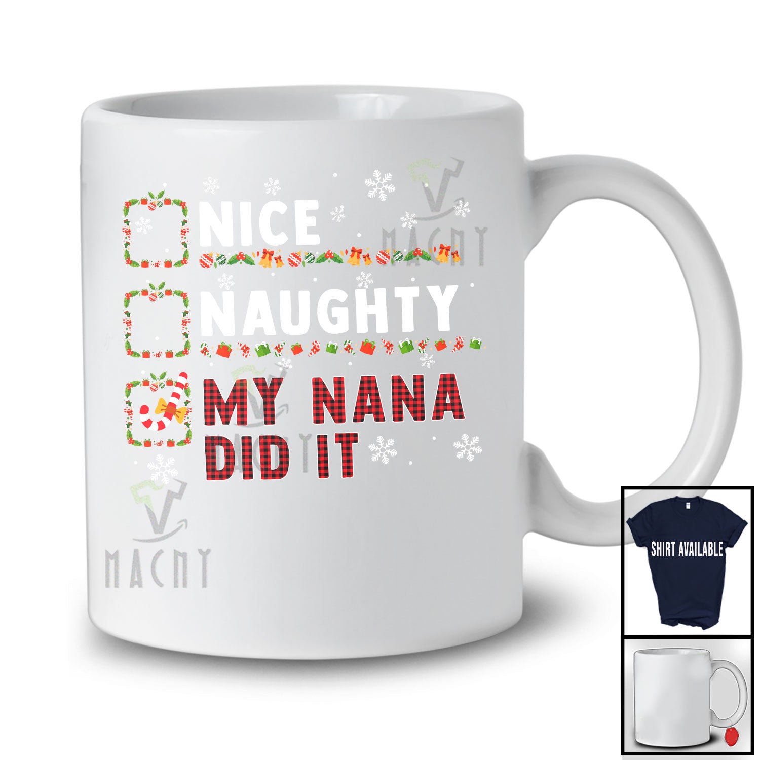 • Nice Naughty My Nana Did It; Wonderful Christmas Red Plaid Santa Snowing; Family Group T-Shirt. This cotton t-shirt is a durable staple product with a classic fit. One of the most popular items, it has a relaxed style made for everyday and casual wear.
