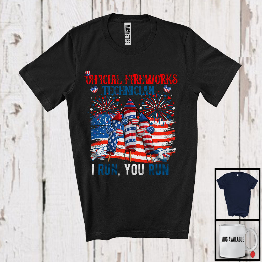 • Official Fireworks Technician I Run You Run, Amazing 4th Of July US Flag Firecrackers, Patriotic T-Shirt. This cotton t-shirt is a durable staple product with a classic fit. One of the most popular items, it has a relaxed style made for everyday and casual wear.