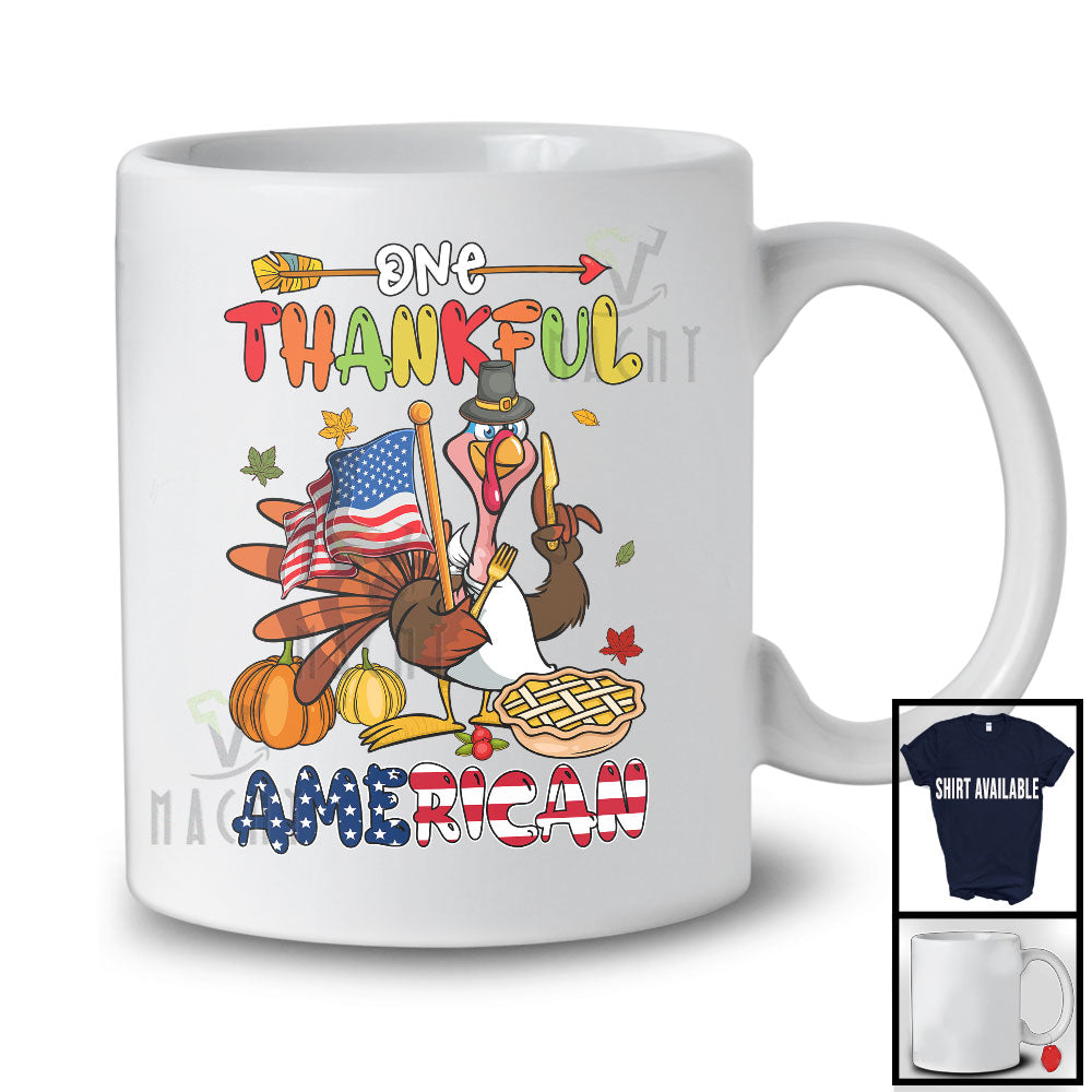 • One Thankful American; Cheerful Thanksgiving Turkey Proud America Flag; Autumn Pumpkin Pie T-Shirt. This cotton t-shirt is a durable staple product with a classic fit. One of the most popular items, it has a relaxed style made for everyday and casual wear.