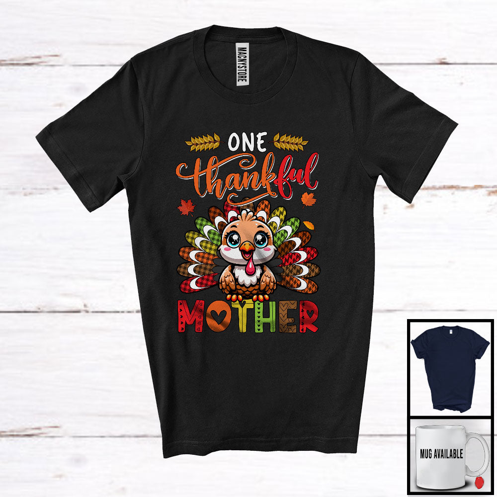 • One Thankful Mother; Amusing Thanksgiving Turkey Plaid Tail; Autumn Leaf Family Group T-Shirt. This cotton t-shirt is a durable staple product with a classic fit. One of the most popular items, it has a relaxed style made for everyday and casual wear.