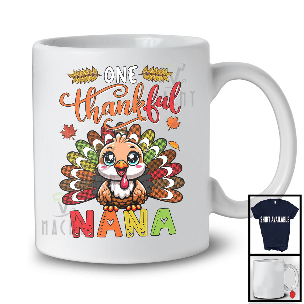 • One Thankful Nana; Amusing Thanksgiving Turkey Plaid Tail; Autumn Leaf Family Group T-Shirt. This cotton t-shirt is a durable staple product with a classic fit. One of the most popular items, it has a relaxed style made for everyday and casual wear.
