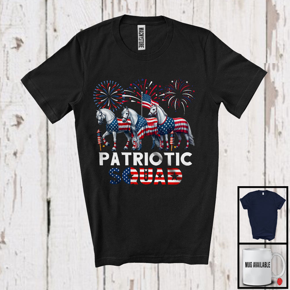 Patriotic Squad, Awesome 4th Of July Three Horse Farmer, American Flag Fireworks Family Group T-Shirt