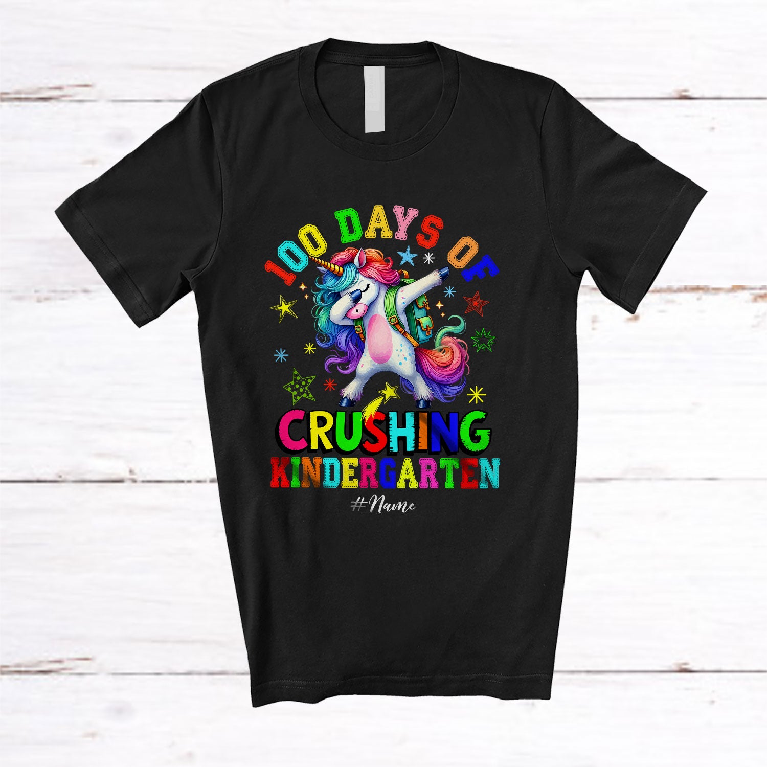 Personalized 100 Days Of Crushing Kindergarten; Joyful Unicorn Dabbing; Custom Name Students T-Shirt. This cotton t-shirt is a durable staple product with a classic fit. One of the most popular items, it has a relaxed style made for everyday and casual wear.