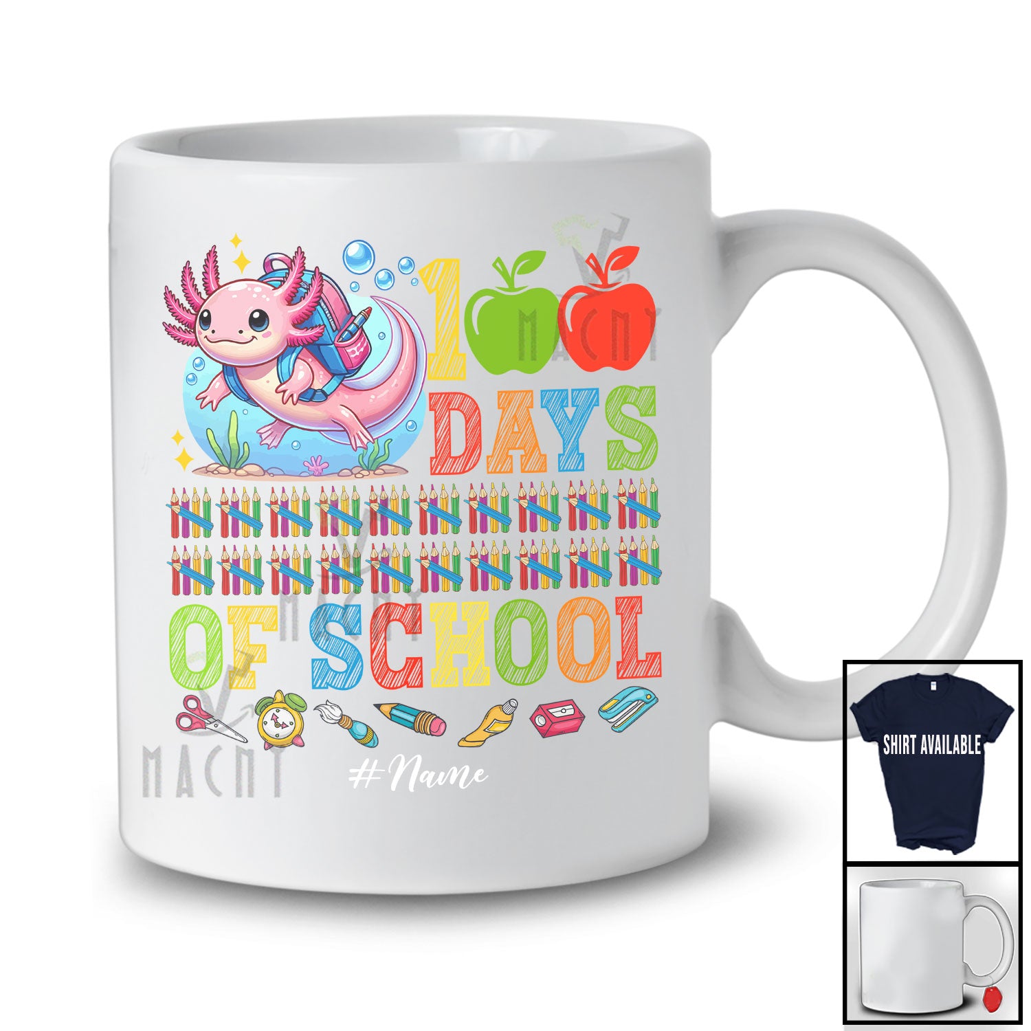 • Personalized 100 Days Of School; Custom Name Cool Axolotl Schoolbag 100th Day T-Shirt. This cotton t-shirt is a durable staple product with a classic fit. One of the most popular items, it has a relaxed style made for everyday and casual wear.